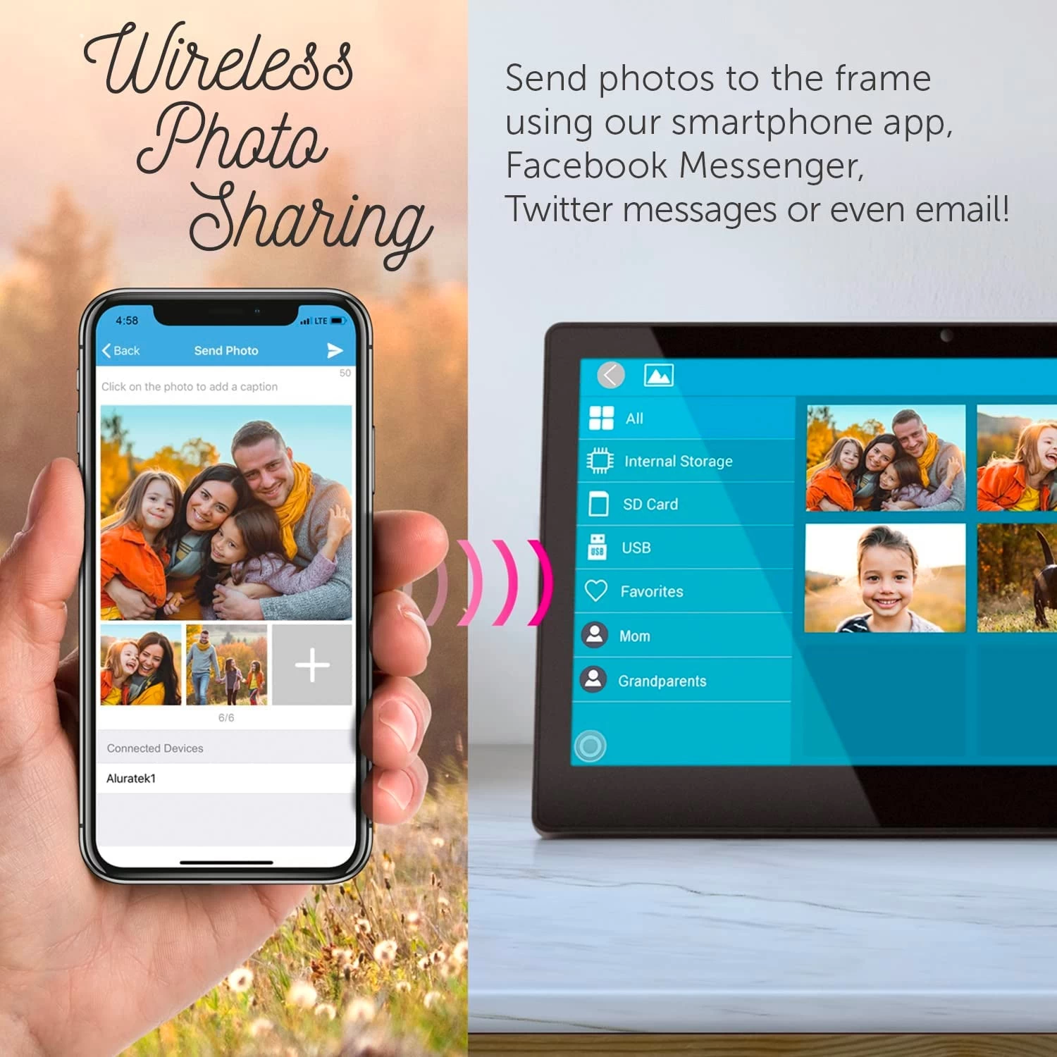– Send photos to the frame using our smartphone app, Facebook Messenger, Twitter Messages or even through email!