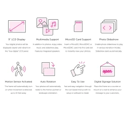 Place the frame on any counter surface or mount the frame on a wall in your place of business to enhance your message to your customers. Use pictures in slideshow mode to display business hours, menu boards and showcase sale items and services. The possibilities are endless!
