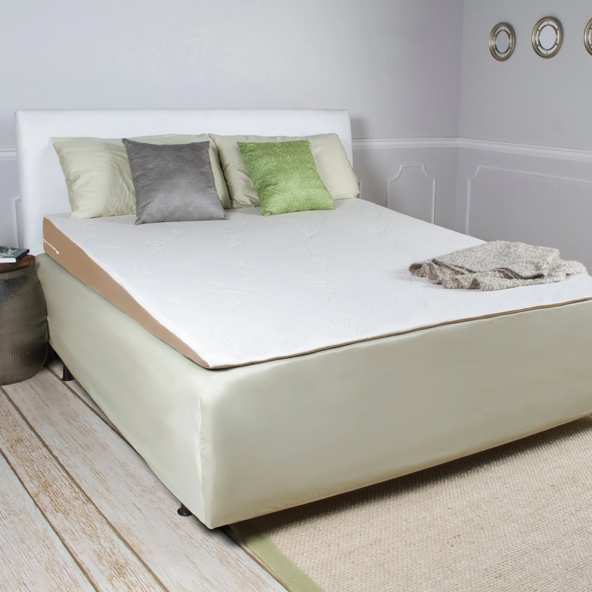 With the Avana Incline Memory Foam Mattress Topper you get all the benefits of our acid reflux pillows but in a size that fits the entire width and length of your bed. The gentle elevation of this unique slanted mattress topper can help those who suffer from GERD, night-time heartburn, or sinus problems, and by extending all the way to the foot of the bed, getting relief from these ailments has never been so comfortable. The Avana Incline Mattress Topper works much like a hospital bed, but better, offering relief through elevation. Your whole torso is gently lifted by our soft foam, providing an ideal sleep surface. Our precise angles can help you breathe easier while relieving pressure from your chest or sinuses and sending you down the path towards dreamland. The Incline Mattress Topper can even help diminish swelling due to surgery or injury, and it can give relief to aching swollen feet. Available in two sizes, these one-of-a-kind mattress toppers fit across the entire length and width of a Queen or King Size mattress and even under your personal pillow to fit your sleep style perfectly. The most luxurious pillow of its kind, our mattress toppers are made from ultra comfortable polyurethane foam that gives you the perfect amount of support, while an added layer memory foam contours to your body and cradles you throughout the night. The antimicrobial cover features a bamboo-rayon knit pattern on the front, bookended by plush camel microsuede on the sides, and is both removable and machine-washable to make cleaning a breeze.