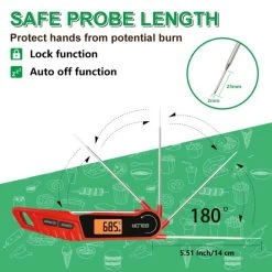 Easy and safe: The Kitchen thermometer with foldable probe design folds away easily and locks into the base for portability; You can extend it 180 degrees when used. An extra-long probe (5.5 inches) allows you a safe distance from hot dishes, and the magnetic back and hook enable convenient storage.