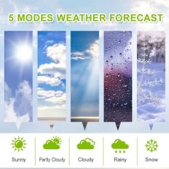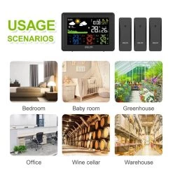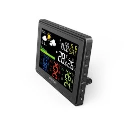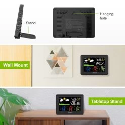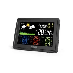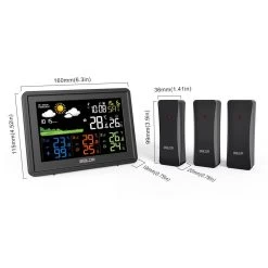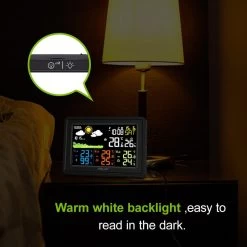 With three outdoor sensors, this weather station can tell you the real-time temperature and humidity levels of up to four locations in one glance at its elegant colorful LCD screen. It displays precise information on the current indoor/outdoor temperature and humidity levels and records the day’s highs and lows for temperature and humidity. It also shows the weather forecast for the next 12-24 hours of your location based on the local weather data collected. Time, calendar, and alarm features are also built-in for your convenience. Atomic RCC receiving ensures you are always getting the most accurate time. Its big, bright color screen with a backlight makes viewing super easy. The brightness can be adjusted to 100%, 50%, 3%, or “Off,” depending on your preference. This device has a built-in kickstand and hanging slot so that you can put it anywhere you want.