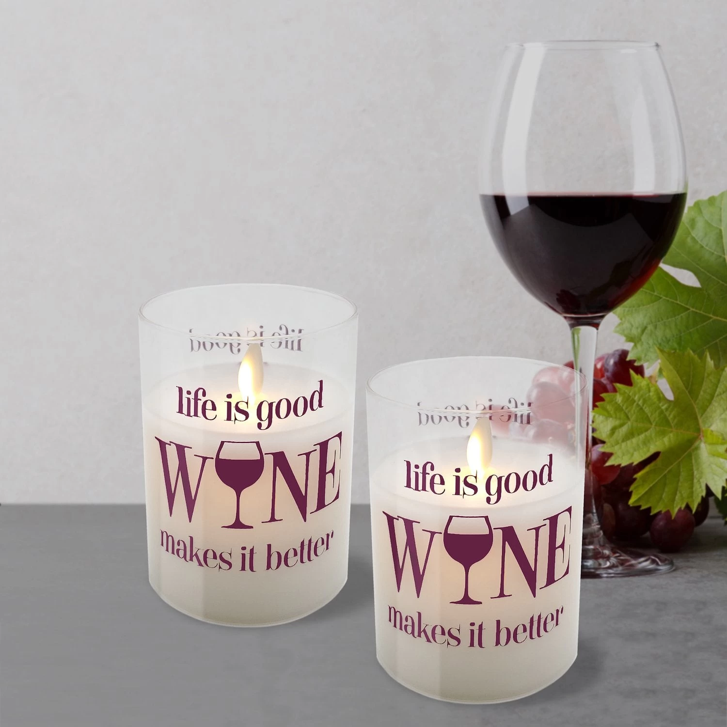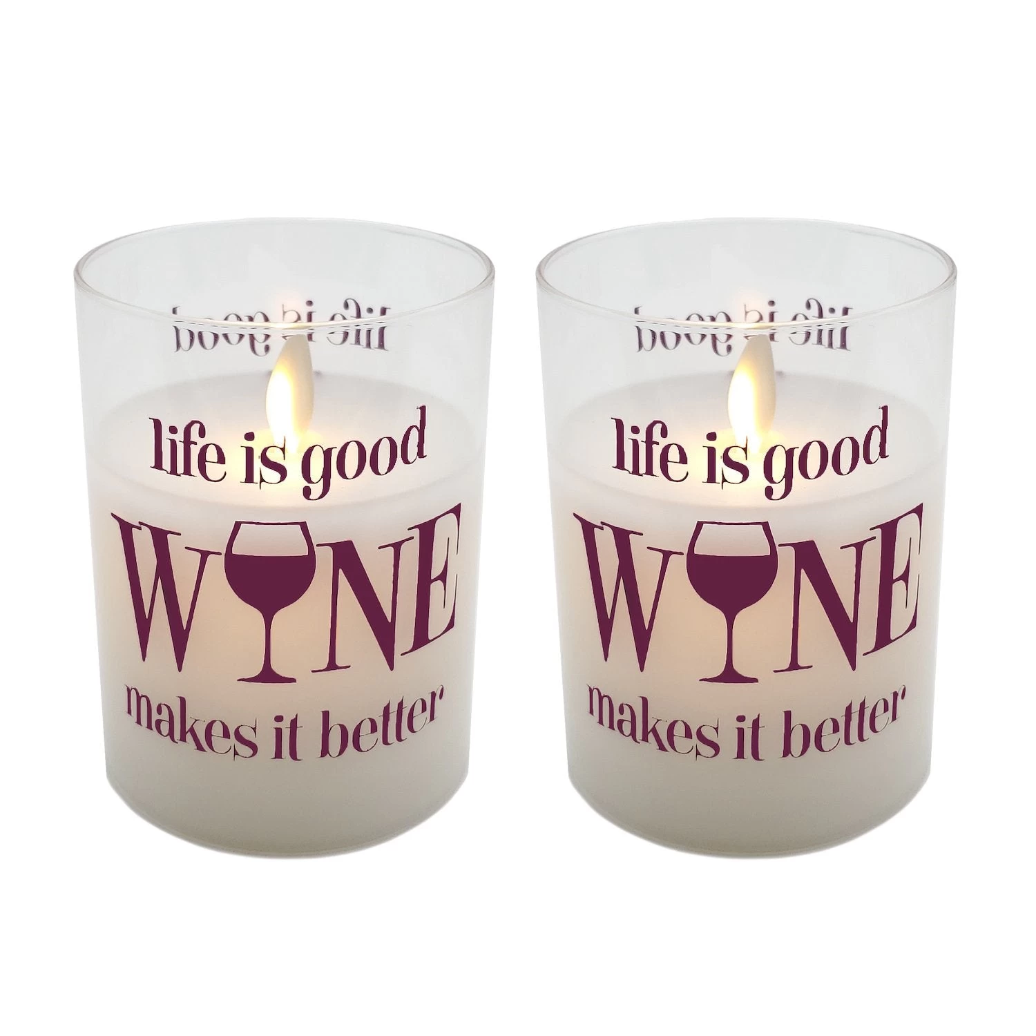Accent your home with this trendy pair of battery operated wine design motion flame candles. The natural moving flame creates the illusion of a real candle. The glass includes genuine poured wax and an enclosed flickering LED light with a timer. The moving flame looks so real, casting natural light, you’ll think it’s a real flame.