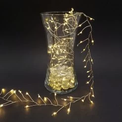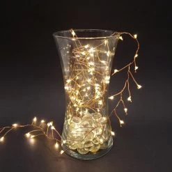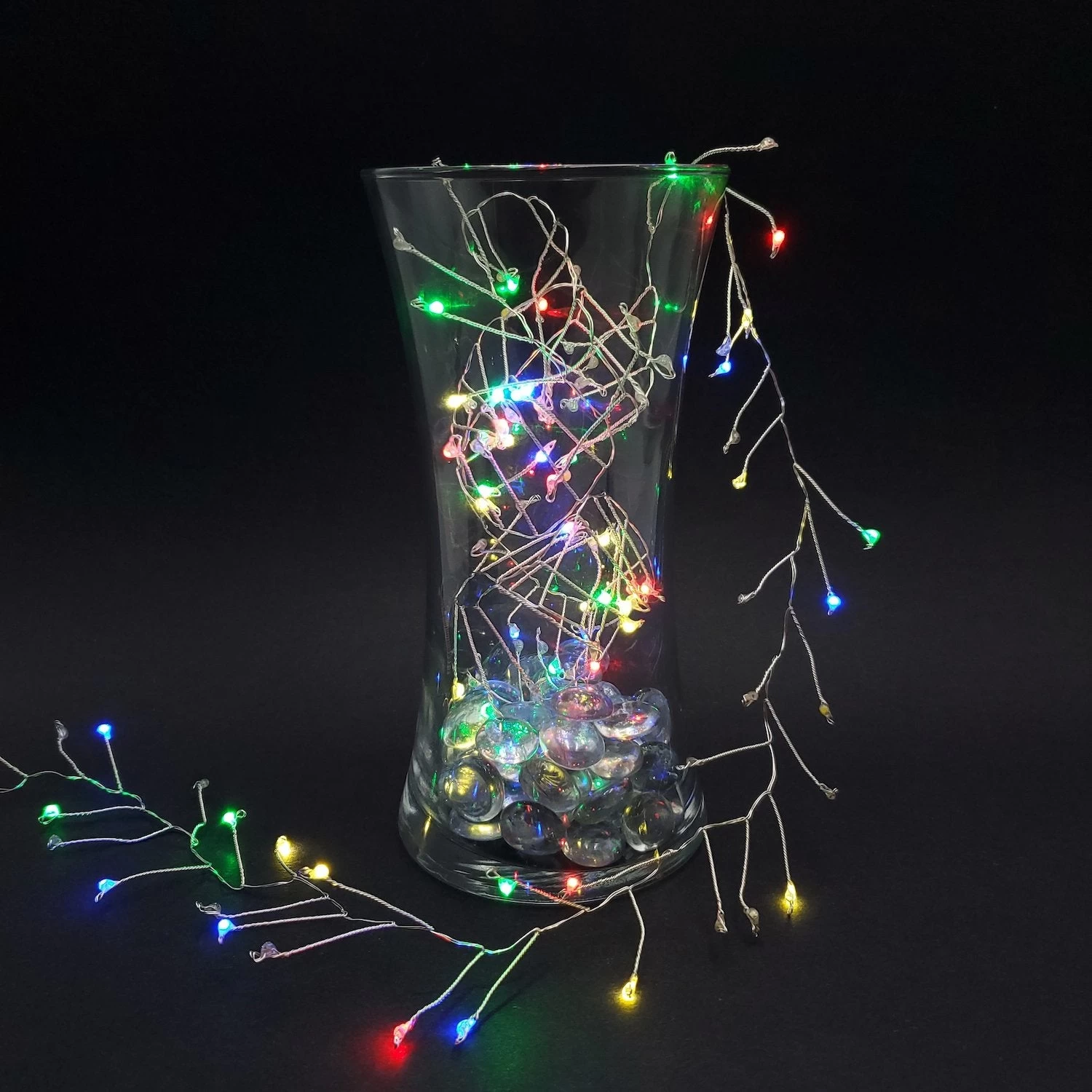 Battery operated firecracker fairy string lights will bring a spectacular ambience to a special event or your everyday home decor. This set of two strands of bendable wire with 100 – 1.5″ off-shoots each with a mini LED light attached to the end creates a firecracker design. The glowing micro LED lights look like a glimmering droplet of water clinging to the end of a shiny wire. These weatherproof lights are perfect for illuminating floral arrangements, table settings, mantles, centerpieces and so much more.