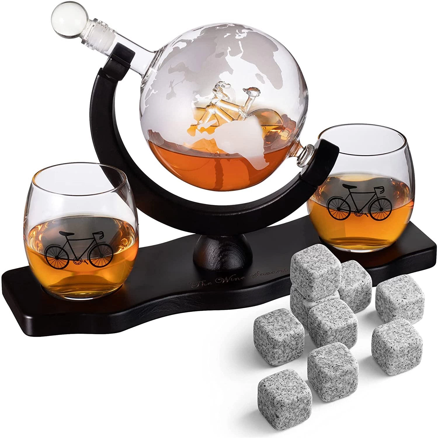 Bicycle Whiskey Decanter Sets With 2 Liquor Glasses – Bike Whisky Decanter & Glass Set With Wood Base And 9 Whiskey Stones