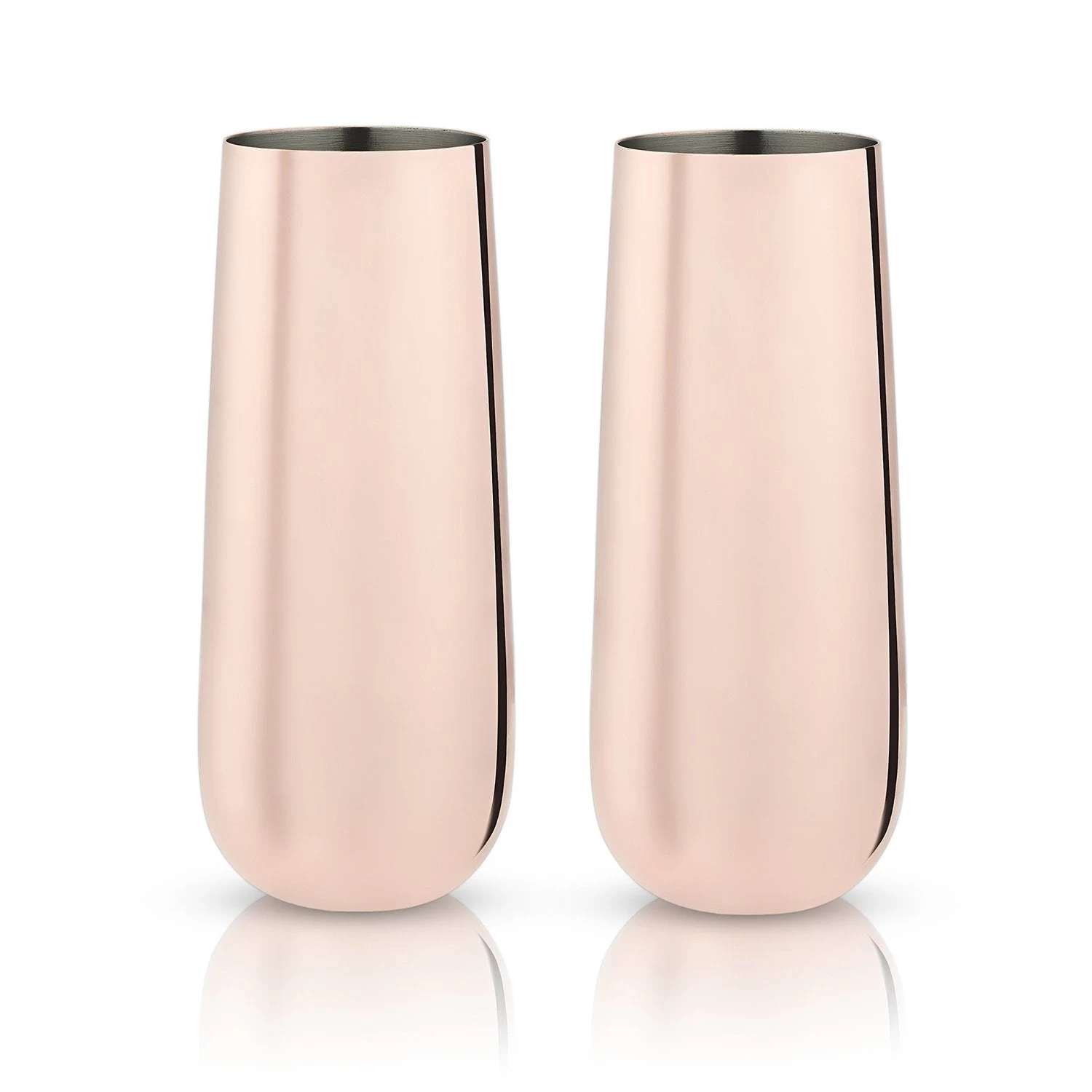 Polished and perfectly rounded to fit in the curve of your palm, these stemless champagne flutes look stunning on any tabletop. Gleaming copper plating catches the light, evoking luxury and warmth.