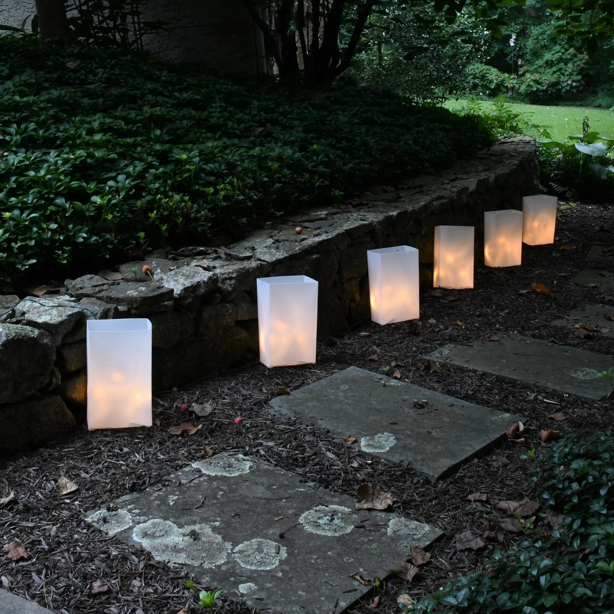 Includes: 6 Plastic Luminaria Lanterns, 6 Anchor Stakes,1 UL Listed Cord with LED Lights