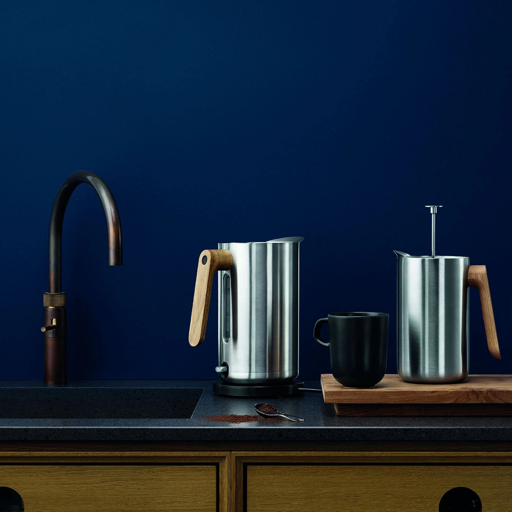 A minimalist design idiom and a functional mindset. This is the essence of Scandinavian design, and the source of inspiration for the Nordic kitchen range. The kitchenware range is the perfect match for Nordic cuisine. This also applies to the elegant Nordic kitchen thermo cafetière in stainless steel with an oak handle. The cafetière keeps coffee hot for longer because it also functions as a vacuum jug. The unique oak handle with its rounded edges provides a secure grip when serving, while the stainless steel pouring spout is completely drip-free. Easy to use: Spoon freshly ground coffee beans into the jug and add boiling water. Stir, and place the plunger in the jug. Allow the coffee to brew for approx. 4 minutes before pressing down the plunger. The coffee is now ready to serve. The plunger is dishwasher-safe, but the jug must be washed by hand because of its oak handle.