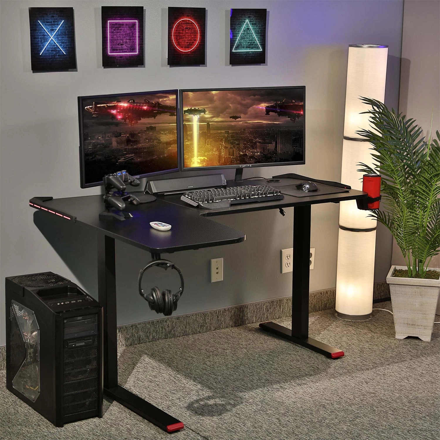 Impact your gaming experience with the Faze L-Frame Fixed Gaming Desk. This feature-packed, space-saving gaming desk will deliver hours of comfortable and fatigue-free playing. Providing a large, ergonomic surface, the Faze gaming desk is perfect for gamers who like to spread out in the heat of battle. Its solid build features steel tube framing and a carbon fiber laminated desktop that can support multiple monitor setups, keyboards, mice, and any other accessories needed for epic gaming. The Faze also features a discreet cable management system for hanging cables and comes equipped with a headphone hook, cup holder and gamepad holder. Illuminate your gaming experience with the attachable RGB LED extension stands and control your gaming ambiance using the built-in buttons on the extension stands.