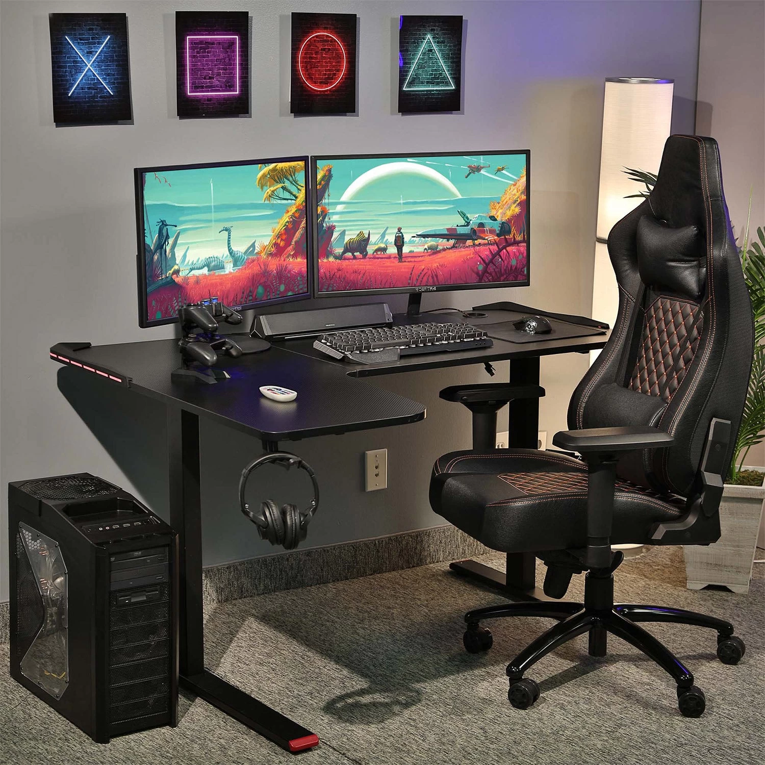 – RGB LED Extension Stands: Equipped with RGB LED lighting for a better gaming experience. Connect the two included extension stands on both sides of the desk to create an illuminated gaming ambiance.
