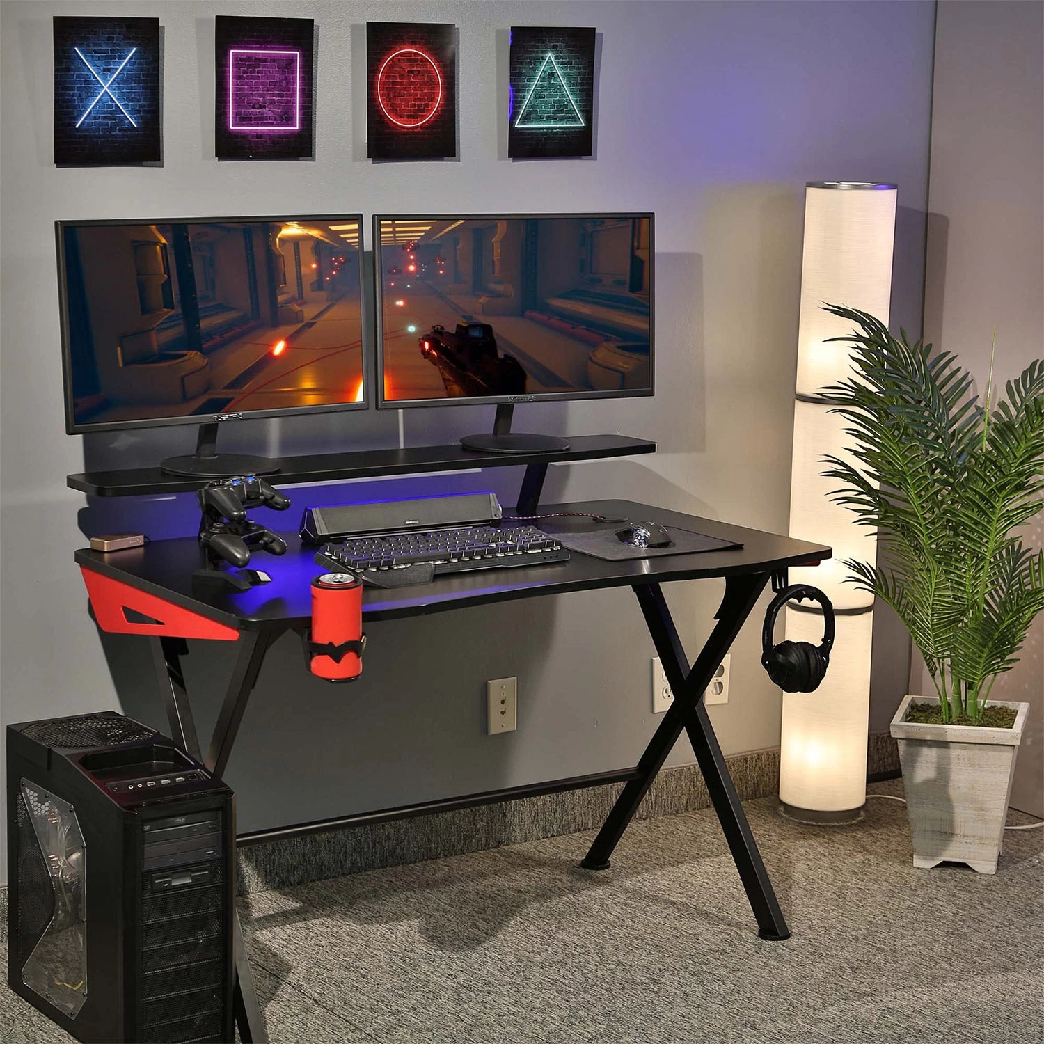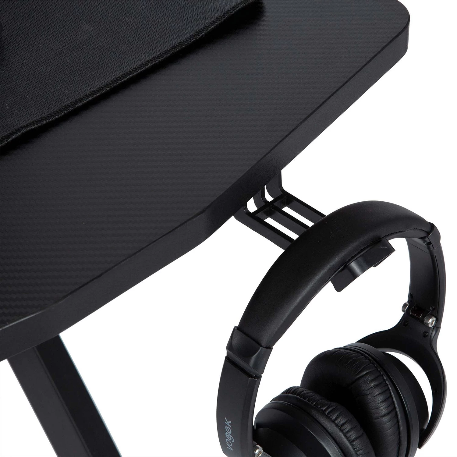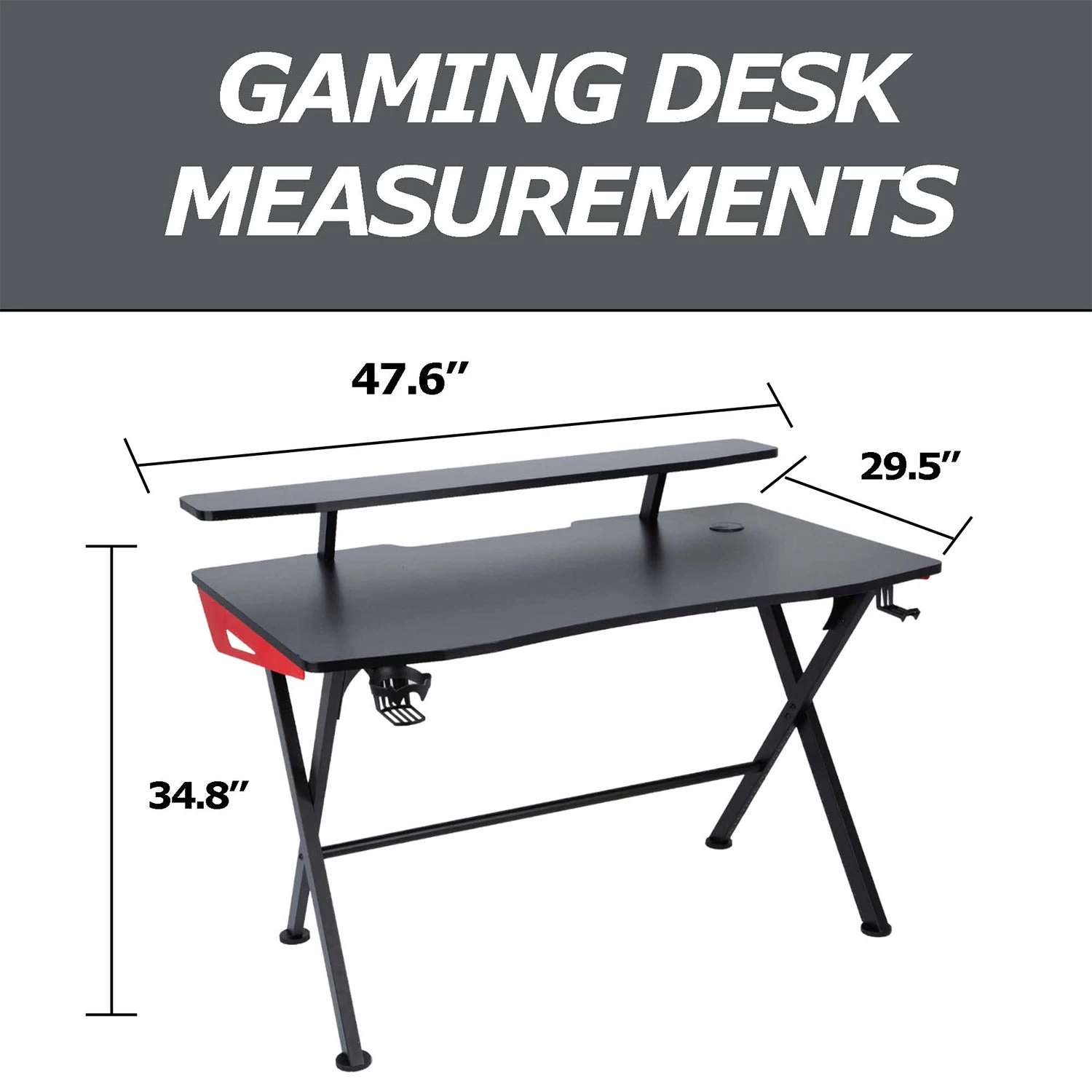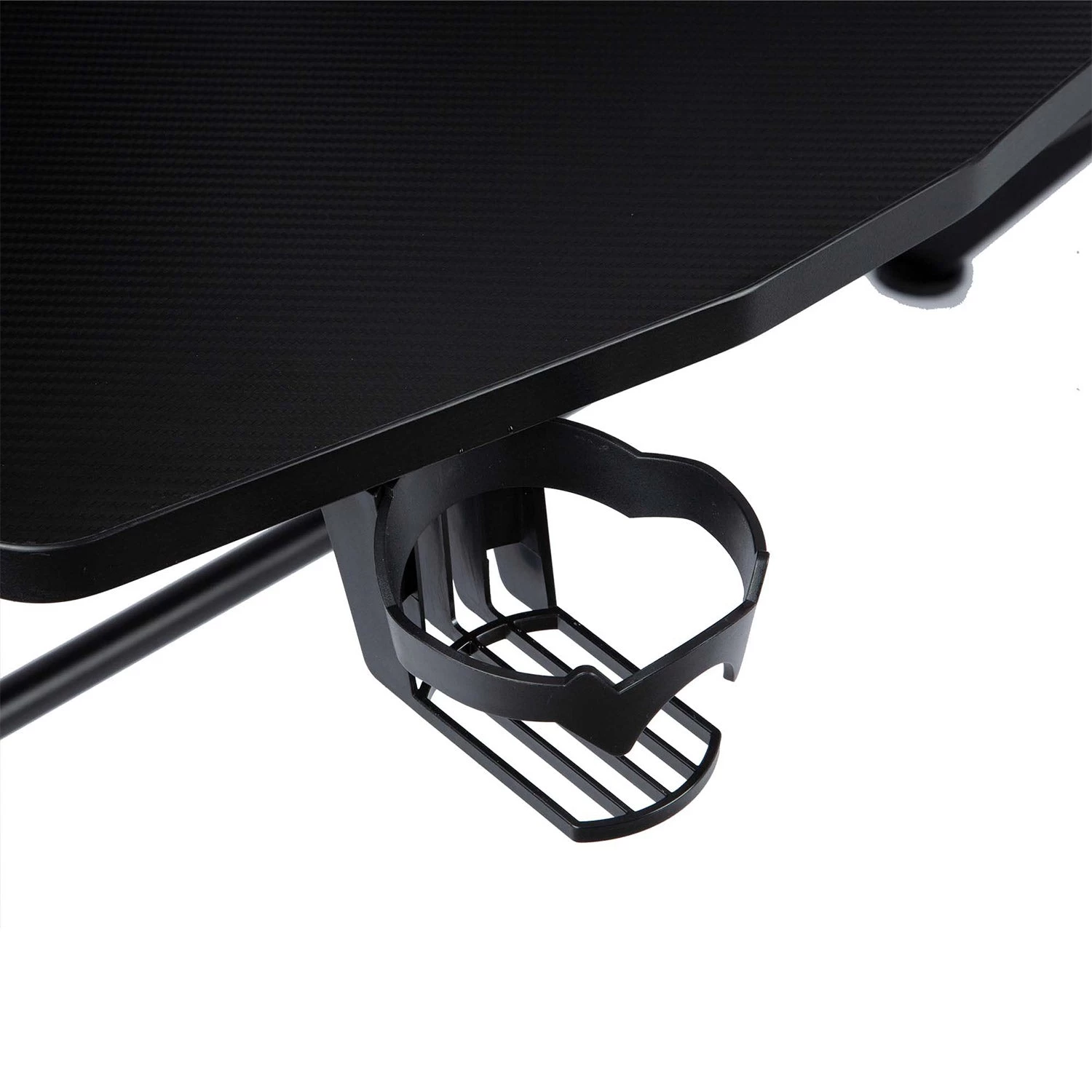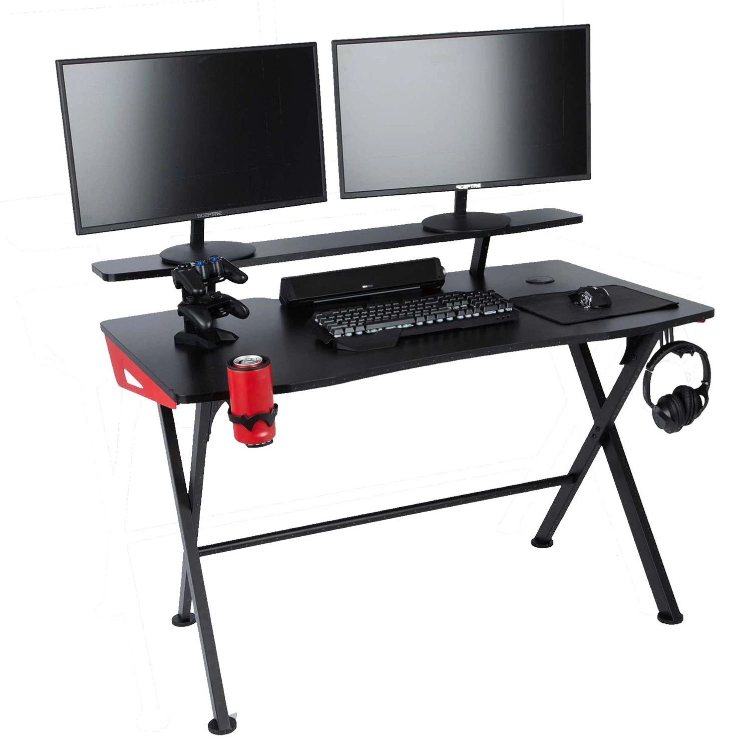 – Large Two-Tier Gaming Surface: The Raid gaming desk has a sleek, carbon fiber texture and the gaming surface has ample space for your gaming monitors, keyboards, and additional gaming gear. Comes with cable management system, headphone hook, cup holder and gamepad holder.