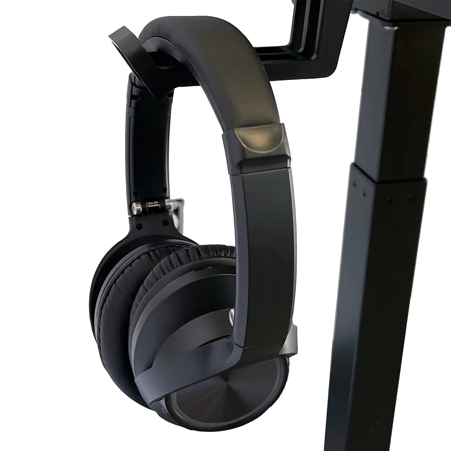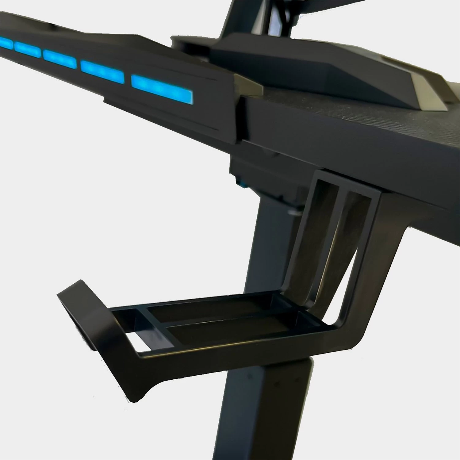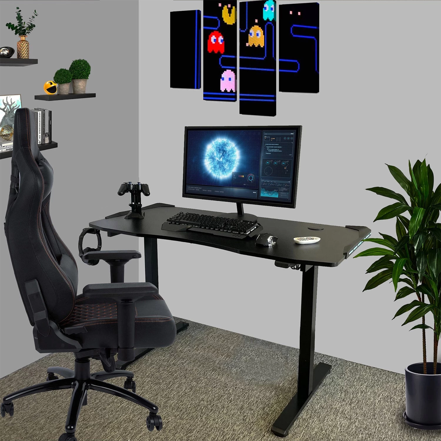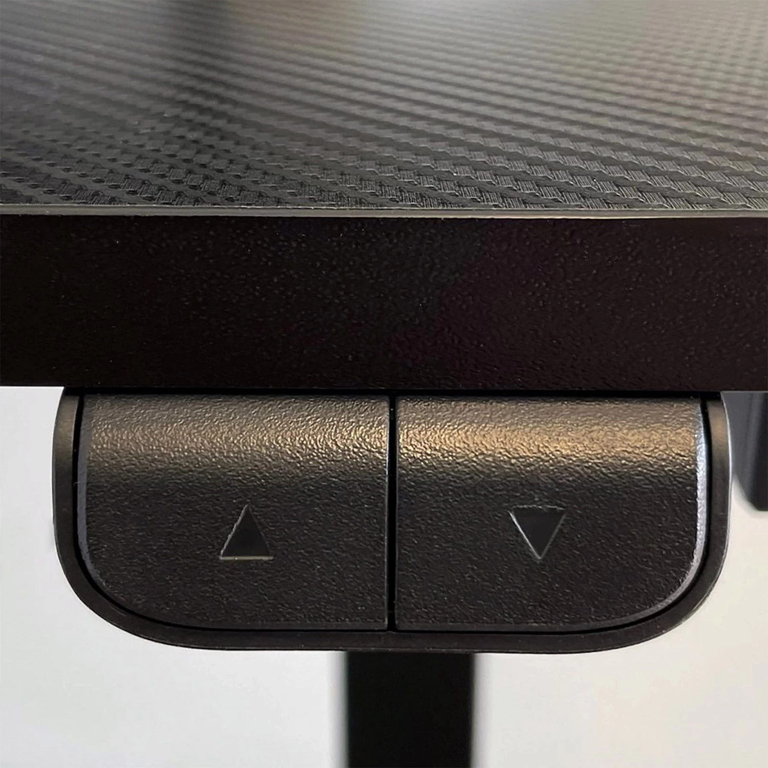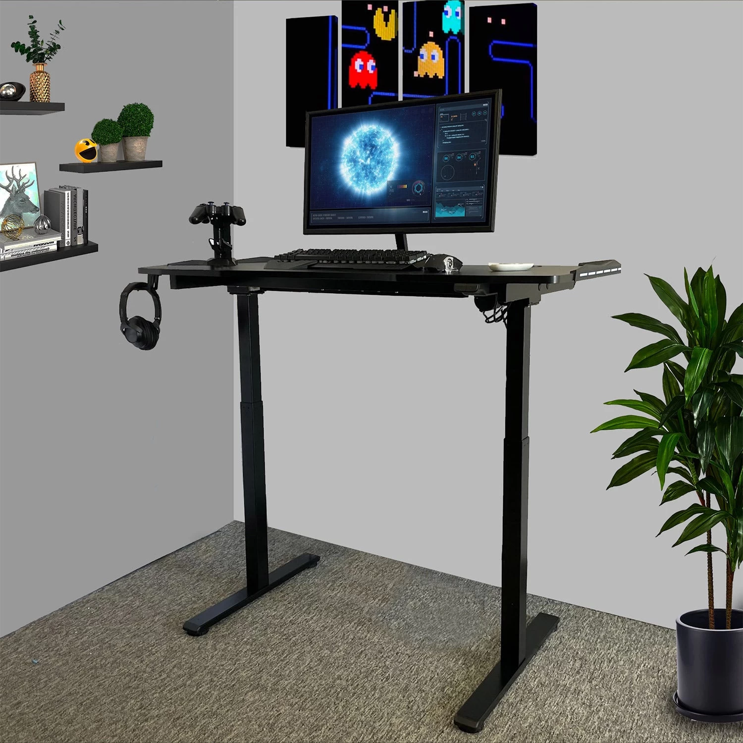 Take your game to new heights with the Tron Electric Height-Adjustable Gaming Desk. This feature-packed, space-saving gaming desk will deliver hours of comfortable and fatigue-free playing. Incorporate healthy movement into your gaming sessions with the push of a button. Simply use the two-button height-adjusting control panel to raise or lower the desk. The single motor will provide seamless height adjustment and ensure that all your gaming gear will stay secure and in place during transitions. Equipped with anti-collision technology, the gaming desk will automatically reverse movement if it encounters an obstacle during height transitions. With a large, ergonomic surface, the Tron gaming desk is perfect for gamers who like to spread out in the heat of battle. Its solid build features steel tube framing and a carbon fiber laminated desktop that can support multiple monitor setups, keyboards, mice, and any other accessories needed for epic gaming. The Tron also features a discreet cable management system for hanging cables and comes equipped with a headphone hook and gamepad holder. Illuminate your gaming experience with the attachable RGB LED extension stands and control your gaming ambiance using the built-in buttons on the extension stands.