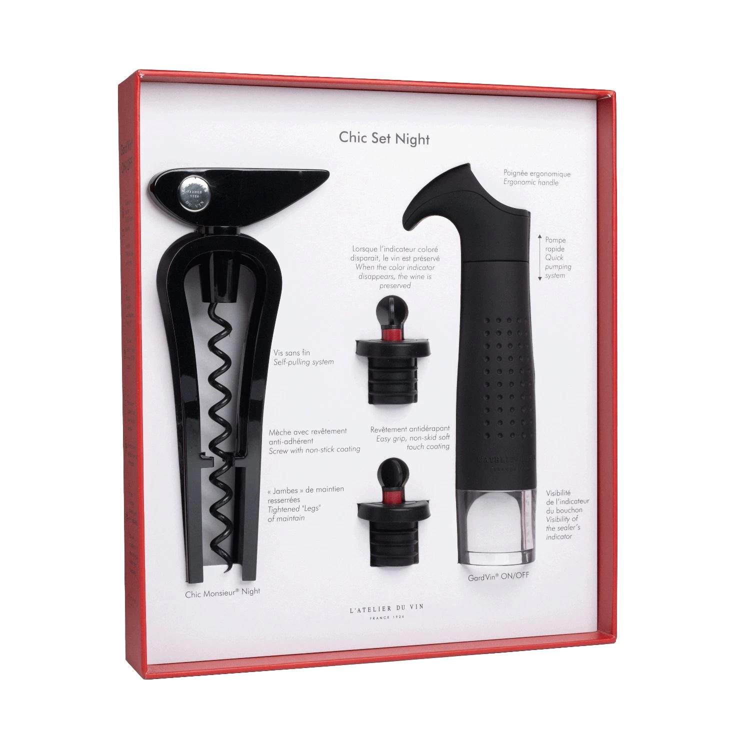 The set includes the Chic Monsieur Night, the Gard’Vin ON/OFF, and two Gard’Vin sealers, all housed inside informative presentation packaging that’s perfect for gifting.