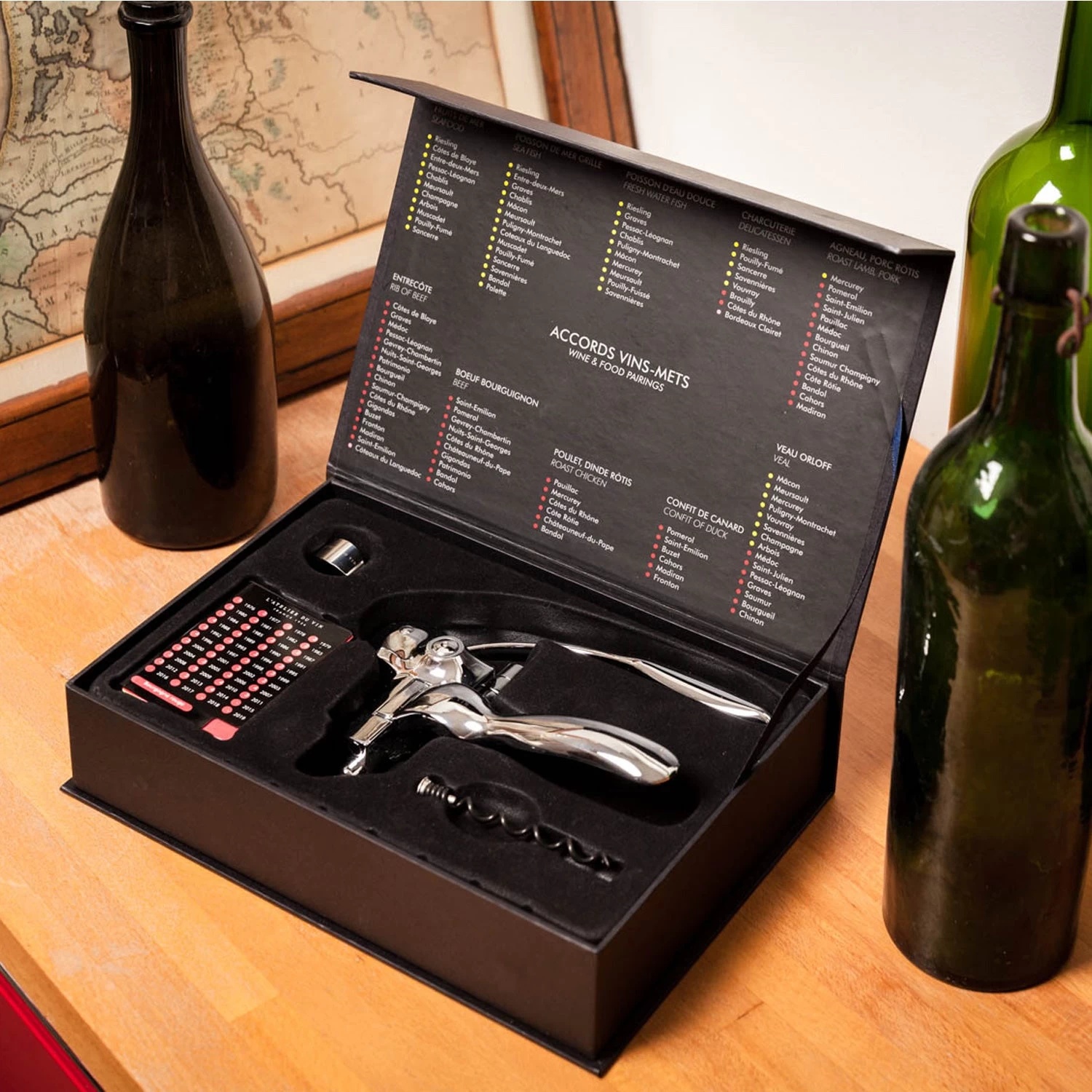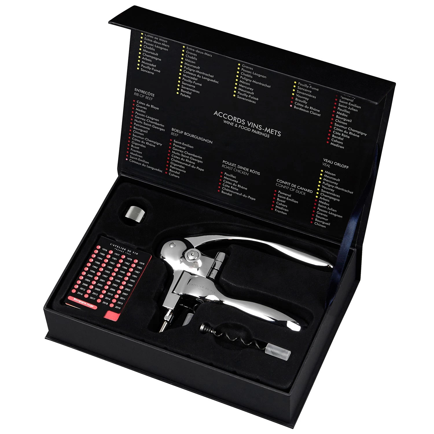 –Â Includes stainless steel lever-style corkscrew, additional spiral, wine ring, food pairing guide, and French vintage wine pocket guide.