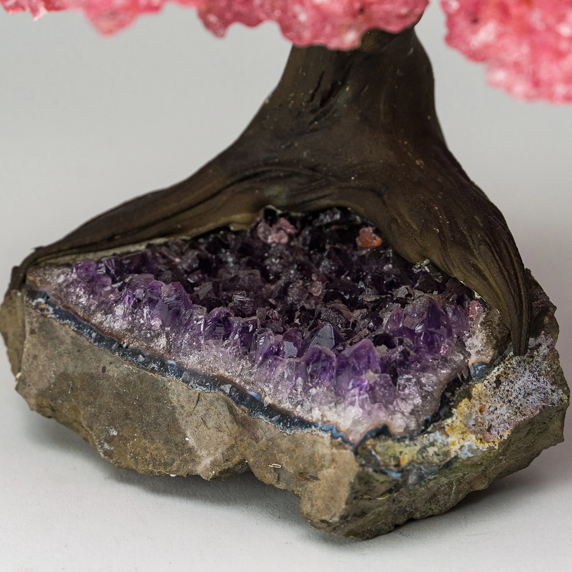 Large genuine Rose Quartz clustered gemstone tree with faux tree trunk set on Amethyst crystal cluster lined matrix – handmade in Brazil. The Love Tree makes for a great gift and a beautiful display item in any room. With its Rose Quartz clustered leaves, this piece enhances ¬ unconditional love and opens the heart to all types of affection. When found with an Amethyst base, this gemstone tree can encourage inner strength. approx. weight: 1.95 lbs, 7 x 6.5 x 5.5 inches ‘ *Stock photo is shown, similar piece will be sent
