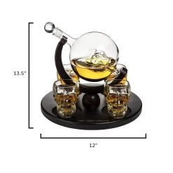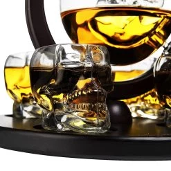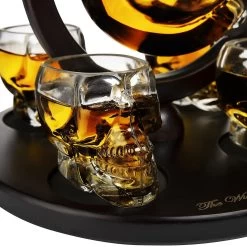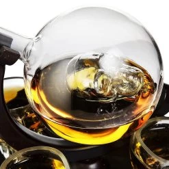 Handcrafted to add a unique design element to the home bar Crafted from solid glass, each liquor decanter contains an intriguing floating glass skull for an eerie feel. Featuring a glass stopper with a rubber base, it can hold in the flavor and aroma of any of your favorite spirits and poisons. Will add a unique design element to the home bar, it plays a key role in creating hauntingly good cocktails. This set comes with 4 glasses.