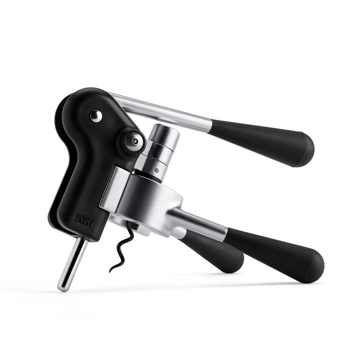 The HOST® Lever Corkscrew makes opening your favorite bottle a breeze. Made of robust die-cast zinc with soft touch grip handles, you can remove any cork with a simple motion. Included is a 3-blade foil cutter for quick removal of foil while the stand provides a home for every piece.