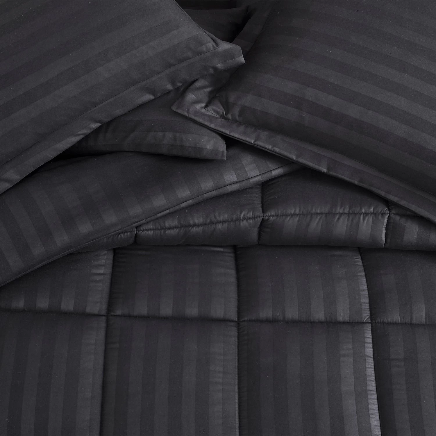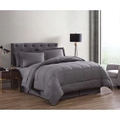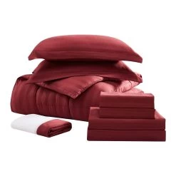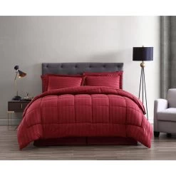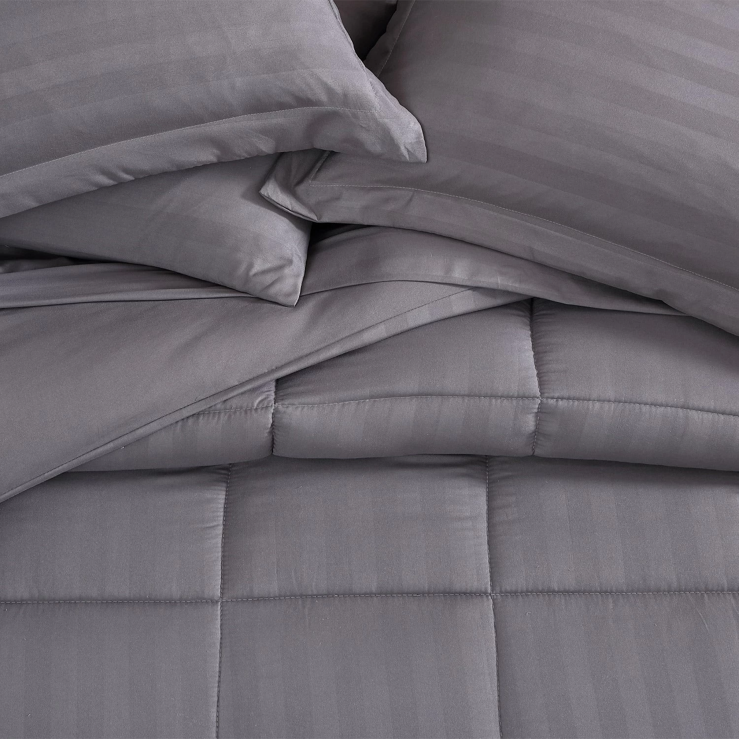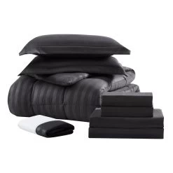 The Nesting Company Maple Dobby Stripe 8 Piece bed in a bag comforter set features luxe comfort and style. Available in a variety of colors, this dobby-striped set matches well with all spaces. Box Quilting design insures the super soft fill stays in place. this set is ideal for winding down after a long day. Made from super soft Microfiber, perfect for year round use. Featuring 1 comforter, 2 shams, 1 flat sheet, 1 fitted sheet, 2 pillow cases, this set completes your bed with ease. This set is machine washable for easy care.