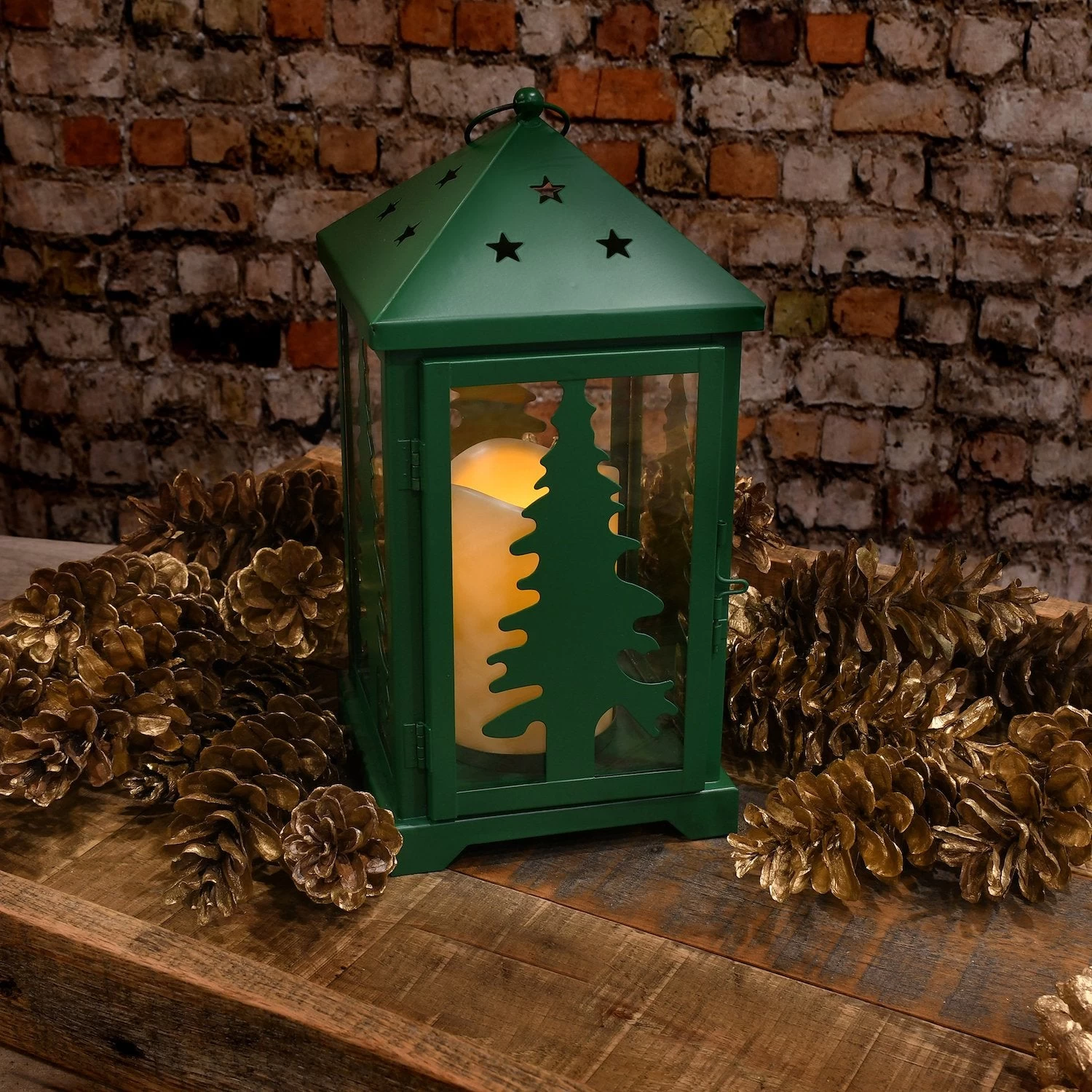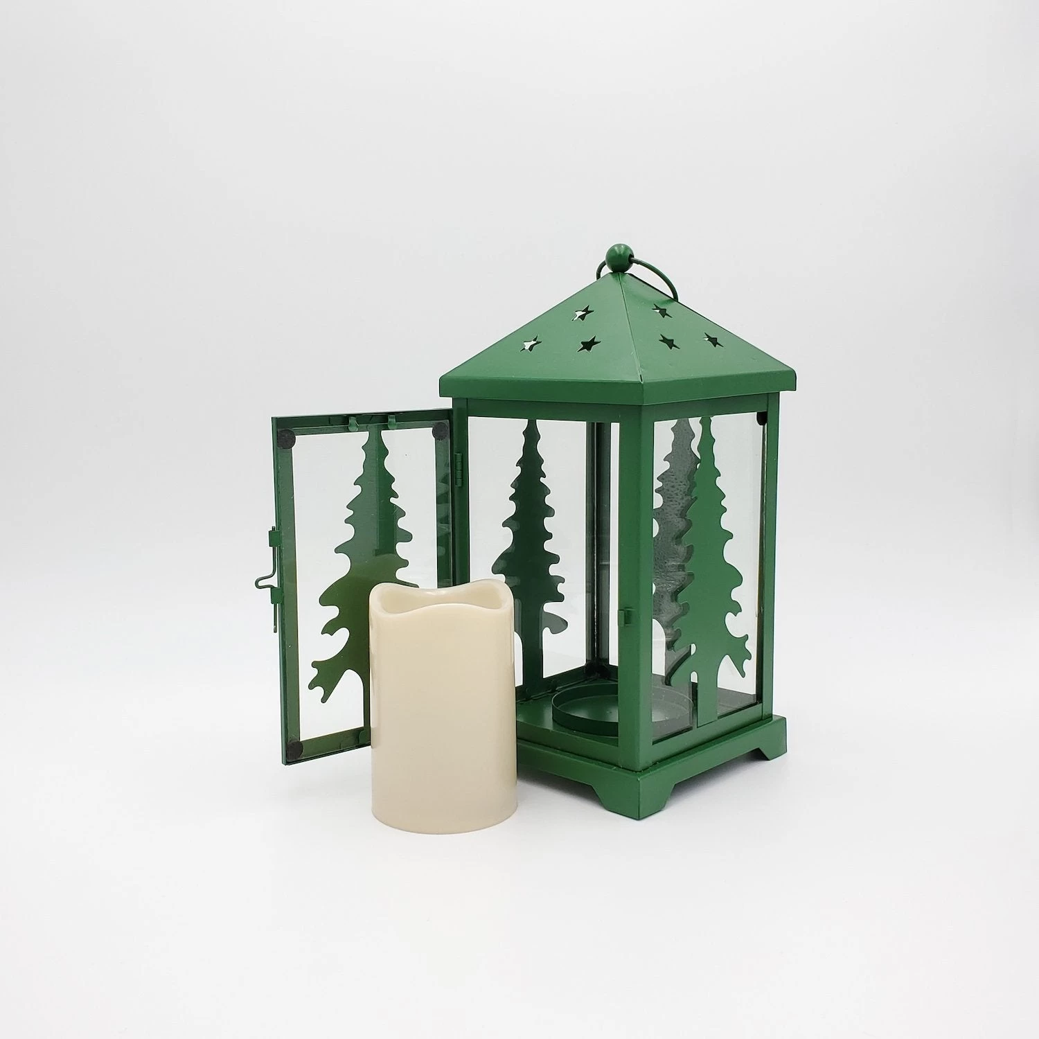 Create a beautiful atmosphere to your holiday decor with this green pine tree metal lantern and LED candle. The removable 4″ flameless candle provides a soft amber glow that illuminates through the crystal clear glass panels. The candle has a convenient timer incorporated 5 hours on 19 hours off.