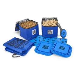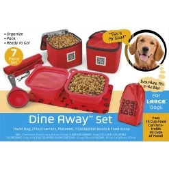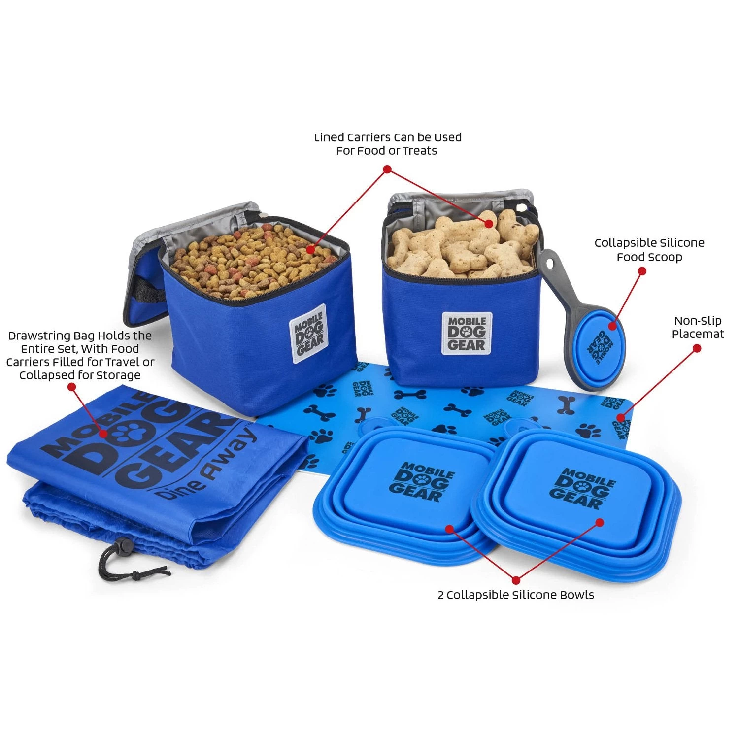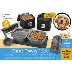 The Mobile Dog Gear Dine Away Set for Med/Lg Dogs, over 25 lbs, is the perfect size for packing your pets food, water, and treats for the day or short trips. This highly functional Dine Away set features: two 15-cup lined food carriers, two 5-cup collapsible silicone pet travel bowls, collapsible silicone food scoop, non-slip placemat, and a drawstring bag which holds the entire set. Dimensions: 21″ L x 9″ H x 6.3″ W.