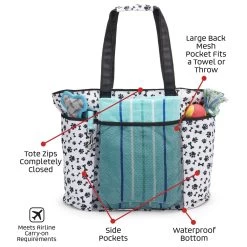 Mobile Dog Gear’s Dogssentials Travel Tote will allow you to bring both you and your dog’s essentials with you while on the go! This travel tote bag includes one lined food carrier for food and treats and one clear zip pouch that can either be secured inside the tote with the tether or detached and used separately as a wristlet! The wristlet is ideal for storing your sunglasses, phone, chargers or any other travel essentials. Features include: 2 side pockets, large front pocket with zipper, large back mesh pocket, inside zip pocket, inside tether and waterproof bottom. The top completely zips closed so you won’t have to worry about items falling out. Our travel bag for dogs also meets airline carry-on requirements and even features a bone shaped luggage ID tag. The tote bag is perfect for carrying essentials such as water bottles, towels or throws, dog toys, doggy bags, leash and more! With this dog travel bag you will have all of your essentials within hand’s reach! Our travel tote has a ripstop fabric that is resistant to tearing and the lined inside is easy to keep clean. Simply hand wash the tote when need be then air dry and you are ready to go again! The cute dog bone and paw design will let everyone know you are a proud dog lover!