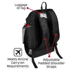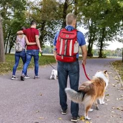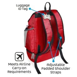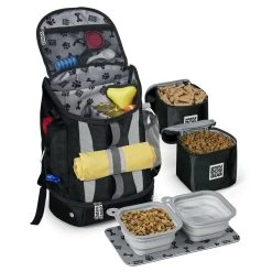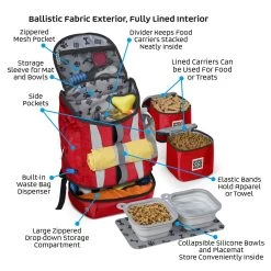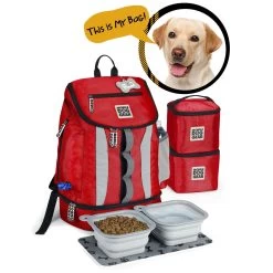 Mobile Dog Gear Drop Bottom Week Away Backpack is the perfect travel bag for any dog owner. This bag includes two 15-cup lined food carriers, two 5-cup collapsible silicone bowls and a non-stick placemat that store conveniently in the main section. There’s a large, zippered drop-bottom section for extra storage, large main compartment, divider for food carriers, two adjustable padded backstraps, front daisy chain elastic bands to hold apparel or towels, side mesh pocket, side zippered fabric pocket, waste bag pocket and a front zippered pocket. This travel bag also meets most airline carry-on requirements, has fashionable rubber hardware and an ID luggage tag. Dimensions: 13″ L x 19″ H x 9″ W
