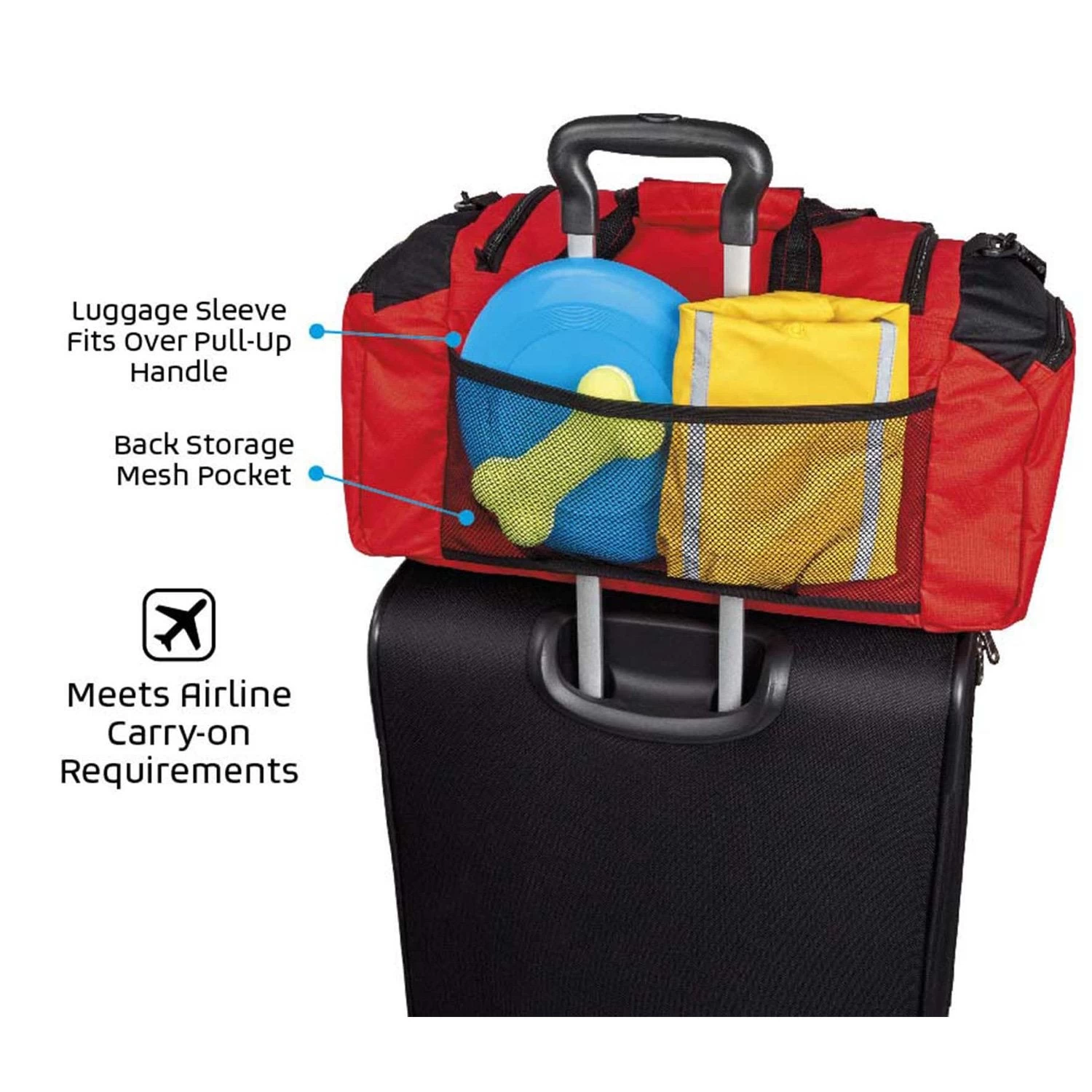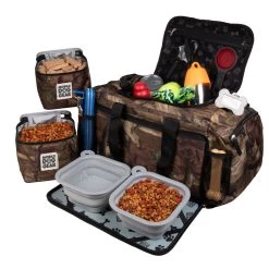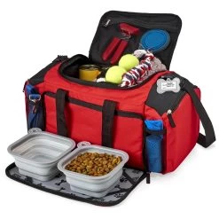 The Mobile Dog Gear Ultimate Week Away Duffle for any size dog is the perfect size for packing your pets belongings for up to a week away. Included are two 15-cup lined food carriers, two 5-cup collapsible silicone bowls and a non-stick placemat that store conveniently in the front flap. This highly functional Ultimate Week Away Duffle features: large main compartment, divider for food carriers, fully lined interior, zip inside mesh pocket, mesh pocket on back and sides, and adjustable padded shoulder strap. Additionally, this travel bag also meets most airline carry-on requirements and features a luggage sleeve that fits over a suitcase pull up handle and an ID luggage tag. Dimensions: 20″ L x 10.5″ H x 10″ W.