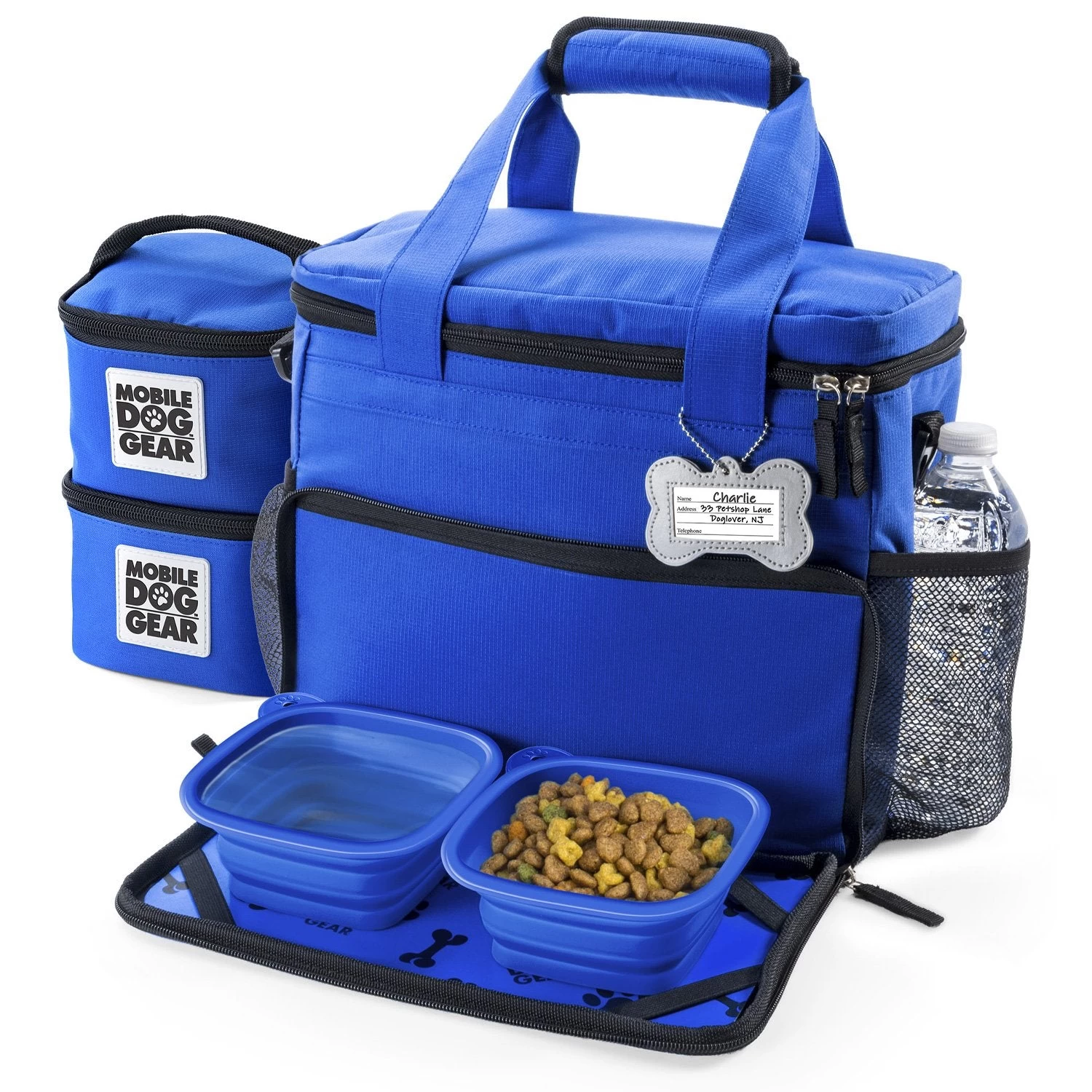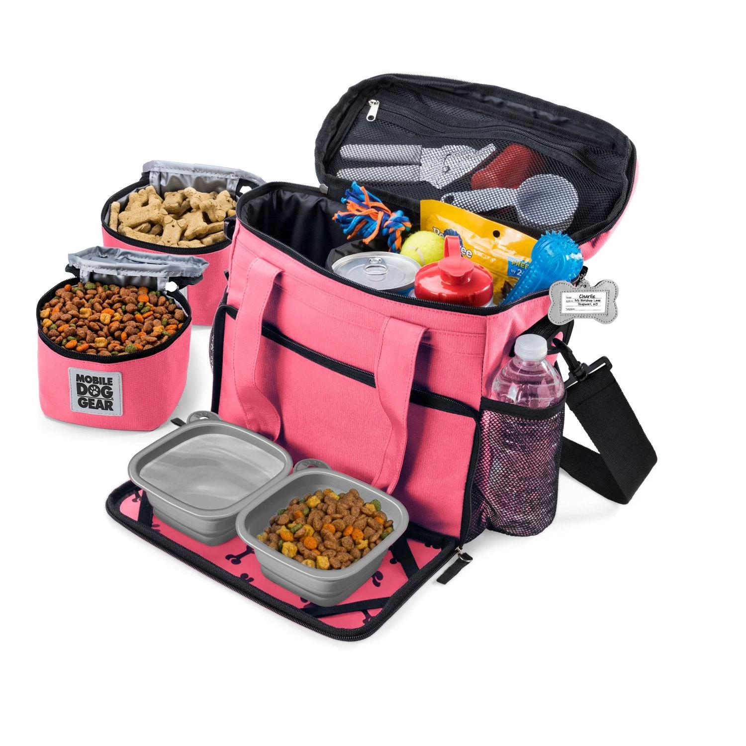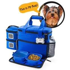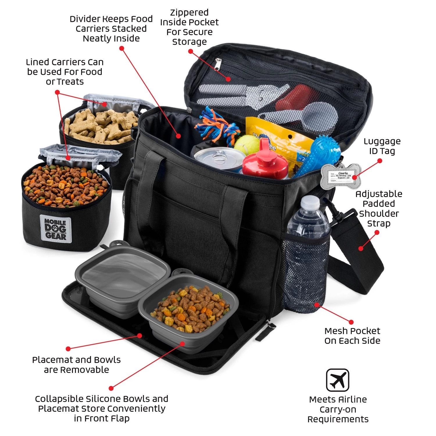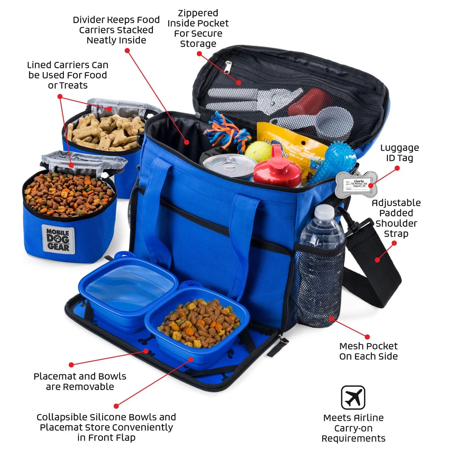 The Mobile Dog Gear Week Away Bag for Small Dogs, under 25 lbs, is the perfect size for packing your pets belongings for up to a week away. Included with your bag are two 5-cup lined food/treat carriers, two 2-cup collapsible silicone bowls and a non-stick placemat that store conveniently in the front flap. This highly functional Week Away bag for small dogs features: large main compartment, front drop down section, divider for food carriers, inside mesh pocket, adjustable padded shoulder strap, and two side mesh pockets. Additionally, this travel bag also meets most airline carry-on requirements and features a luggage sleeve that fits over a suitcase pull up handle and an ID luggage tag. Dimensions: 12″ L x 11″ H x 6″ W.