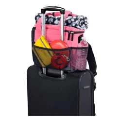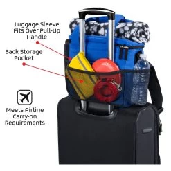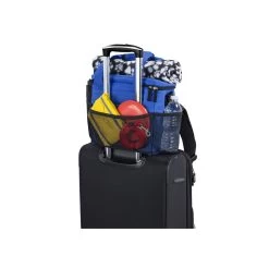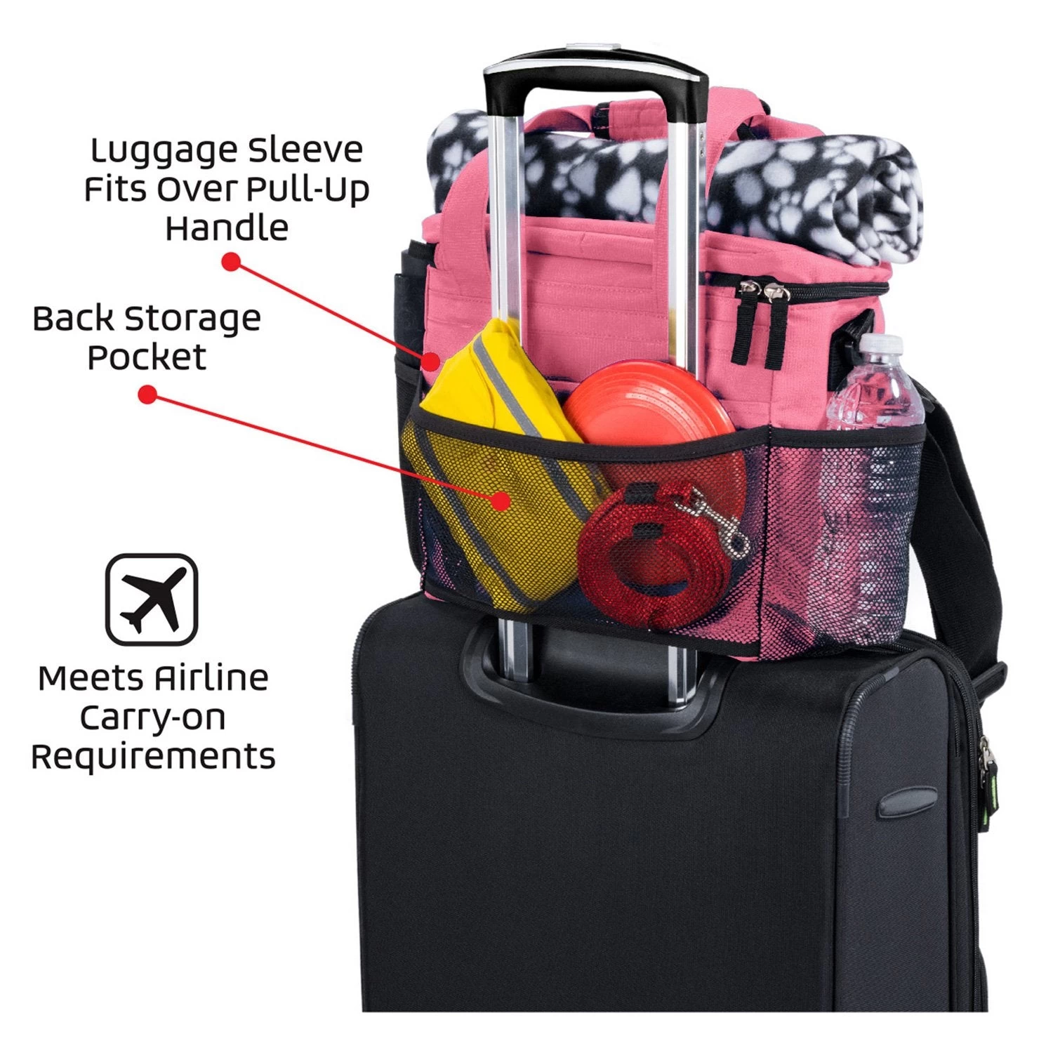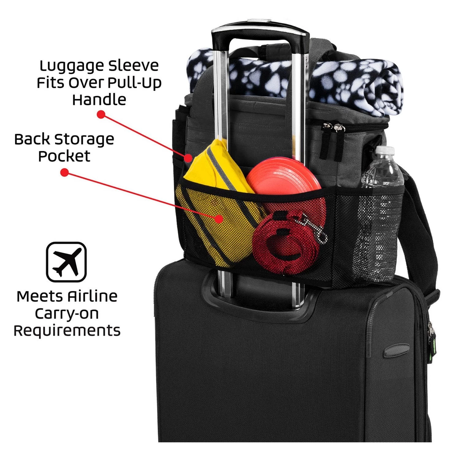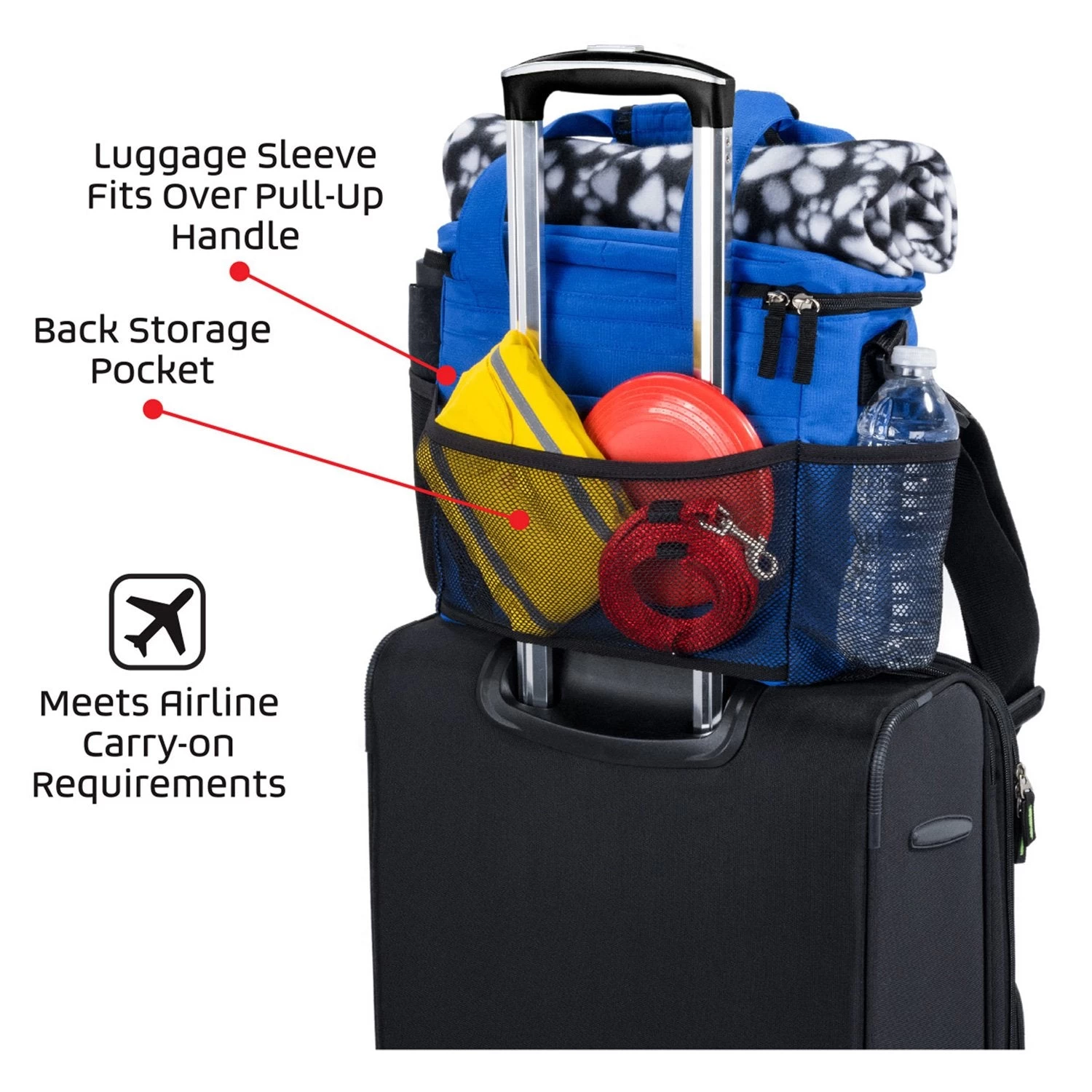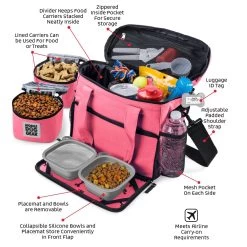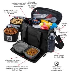 The Mobile Dog Gear Week Away Bag for Small Dogs, under 25 lbs, is the perfect size for packing your pets belongings for up to a week away. Included with your bag are two 5-cup lined food/treat carriers, two 2-cup collapsible silicone bowls and a non-stick placemat that store conveniently in the front flap. This highly functional Week Away bag for small dogs features: large main compartment, front drop down section, divider for food carriers, inside mesh pocket, adjustable padded shoulder strap, and two side mesh pockets. Additionally, this travel bag also meets most airline carry-on requirements and features a luggage sleeve that fits over a suitcase pull up handle and an ID luggage tag. Dimensions: 12″ L x 11″ H x 6″ W.