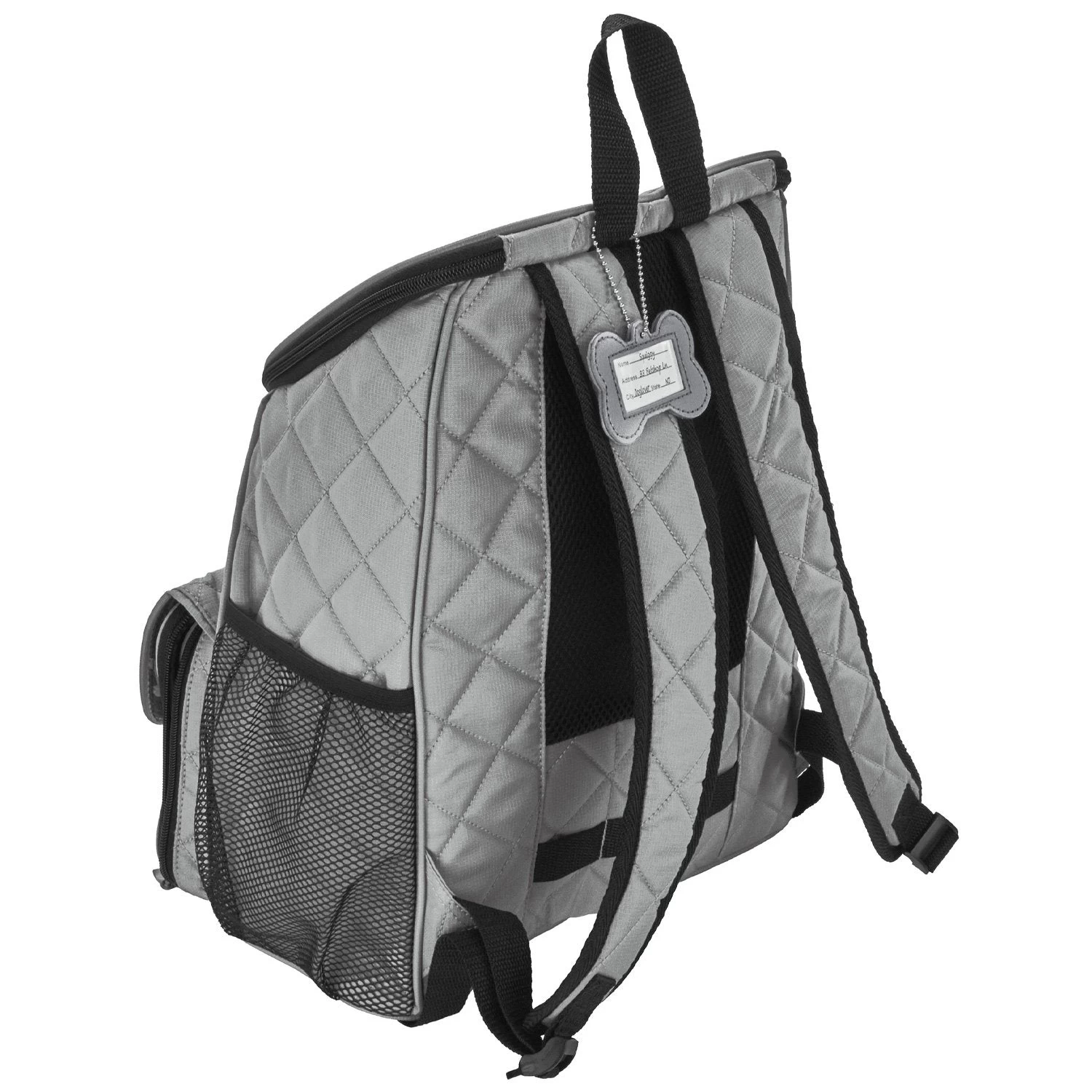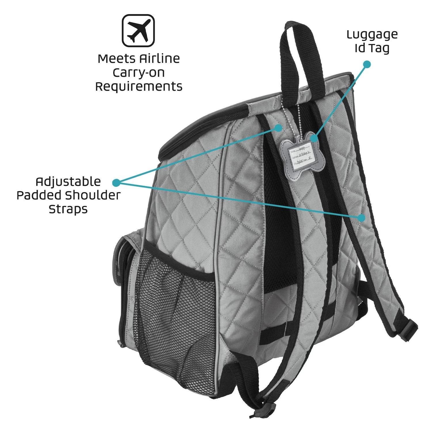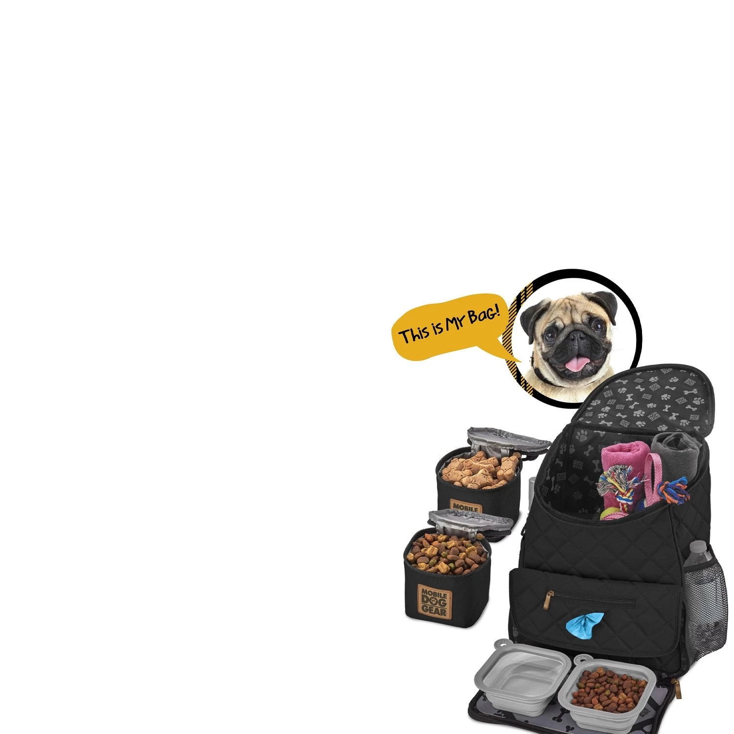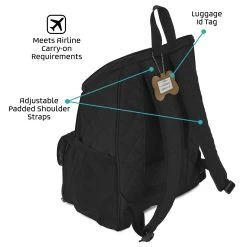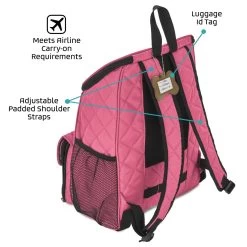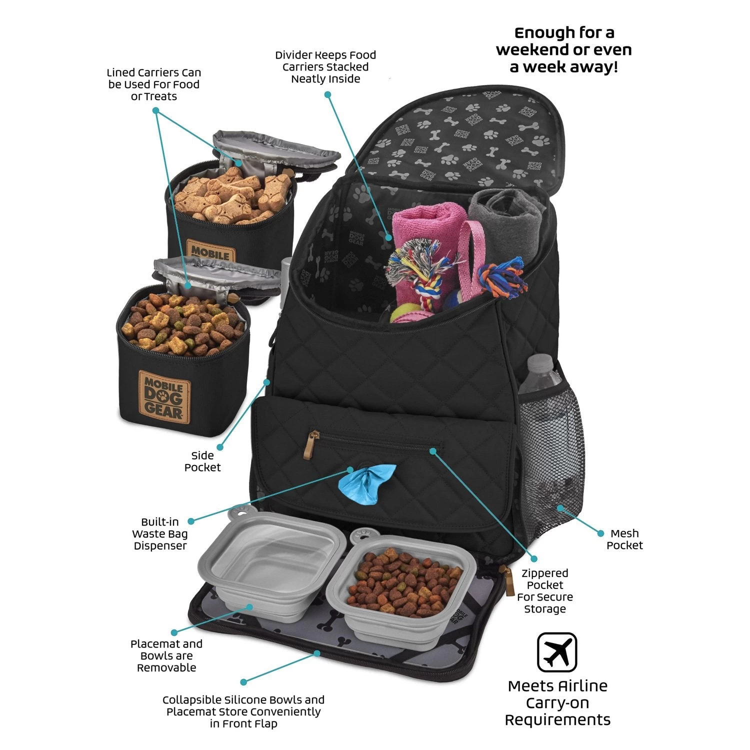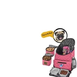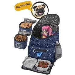 The Mobile Dog Gear Deluxe Weekender backpack can be used for any size dog and is perfect for packing your pets belongings. Included are two 5-cup lined food carriers, two 2-cup collapsible silicone bowls and a non-stick placemat that store conveniently in the front flap. This highly functional Deluxe Quilted Weekender Backpack features: large main compartment, padded backstraps, two side mesh pockets, waste bag pocket and a front zip pocket. Additionally, this travel bag also meets most airline carry-on requirements, has upscale metal hardware and an ID luggage tag. Dimensions: 13″ L x 16″ H x 7″ W.