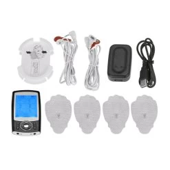 Content: one Digital Pulse Massager, 4 large 2.5″ single-sided adhesive electrode pads, electrode wires, USB cable, AC adapter, instruction manual, and rechargeable internal lithium battery