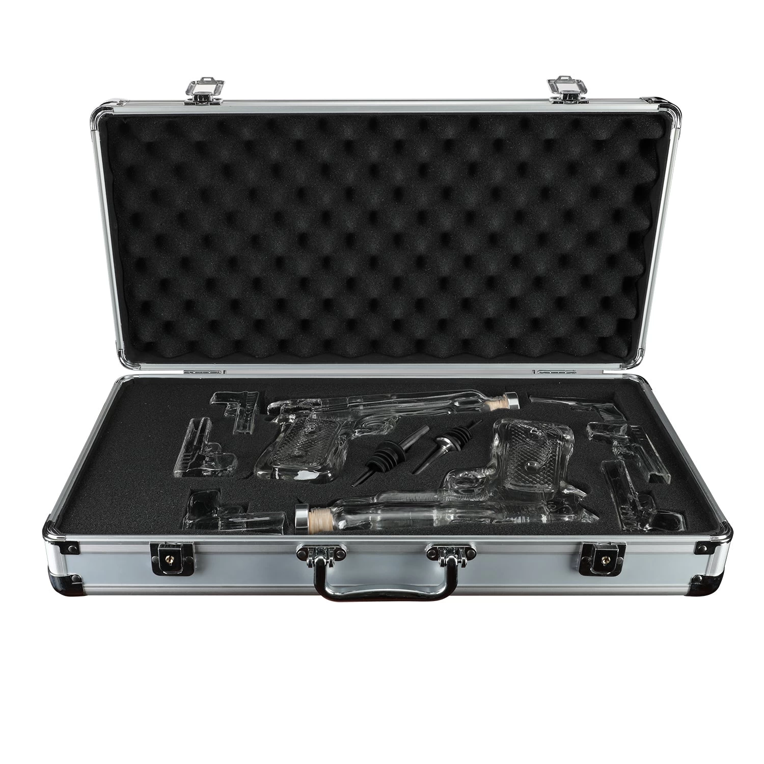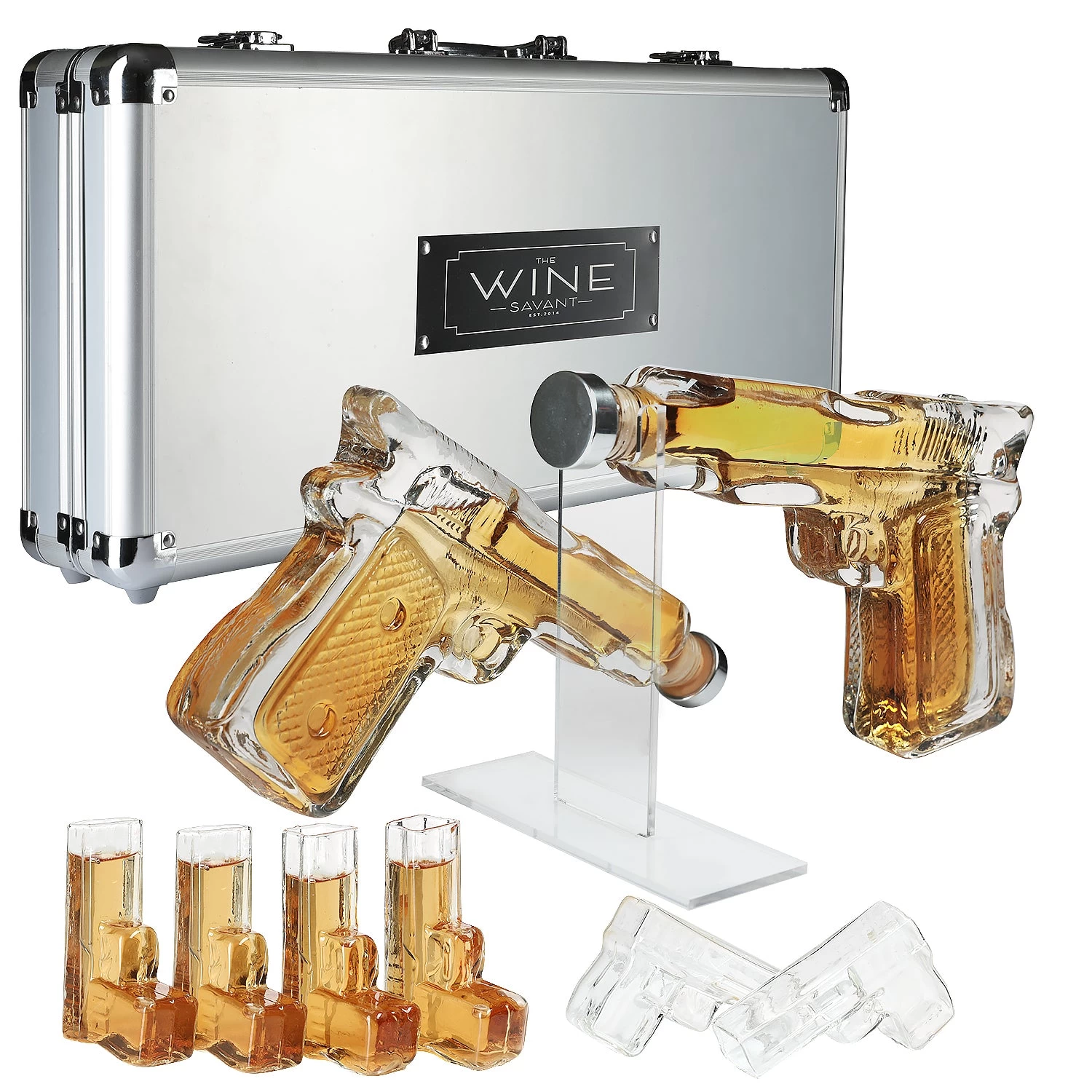 CLASSIC WHISKEY DECANTERS WITH SPOUTS FOR POURING IN ANY PARTY: These boroscilicate glass gun decanters are more delicate yet less destructive than a traditional gun, it is nonetheless an elegantly decorative item to display in your home or bar. The gun is completely hollow, allowing you to use it as an interesting decanter and fill it up with your favorite vintage of Whiskey, Wine, Scotch or Bourbon.