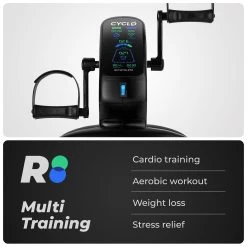 NEW ALL-DIGITAL 2021 MODEL! CYCLO is a technologically advanced solution among modern exercise bikes as it now features an all-digital large LCD backlight screen and comes with a smart remote control. Using the intuitive interface, you can diversify your desk workout sessions by choosing among 12 speeds and multiple resistance modes. The mini exercise bike also has auto and manual modes and supports both forward and reverse pedal motion to work different muscle groups.