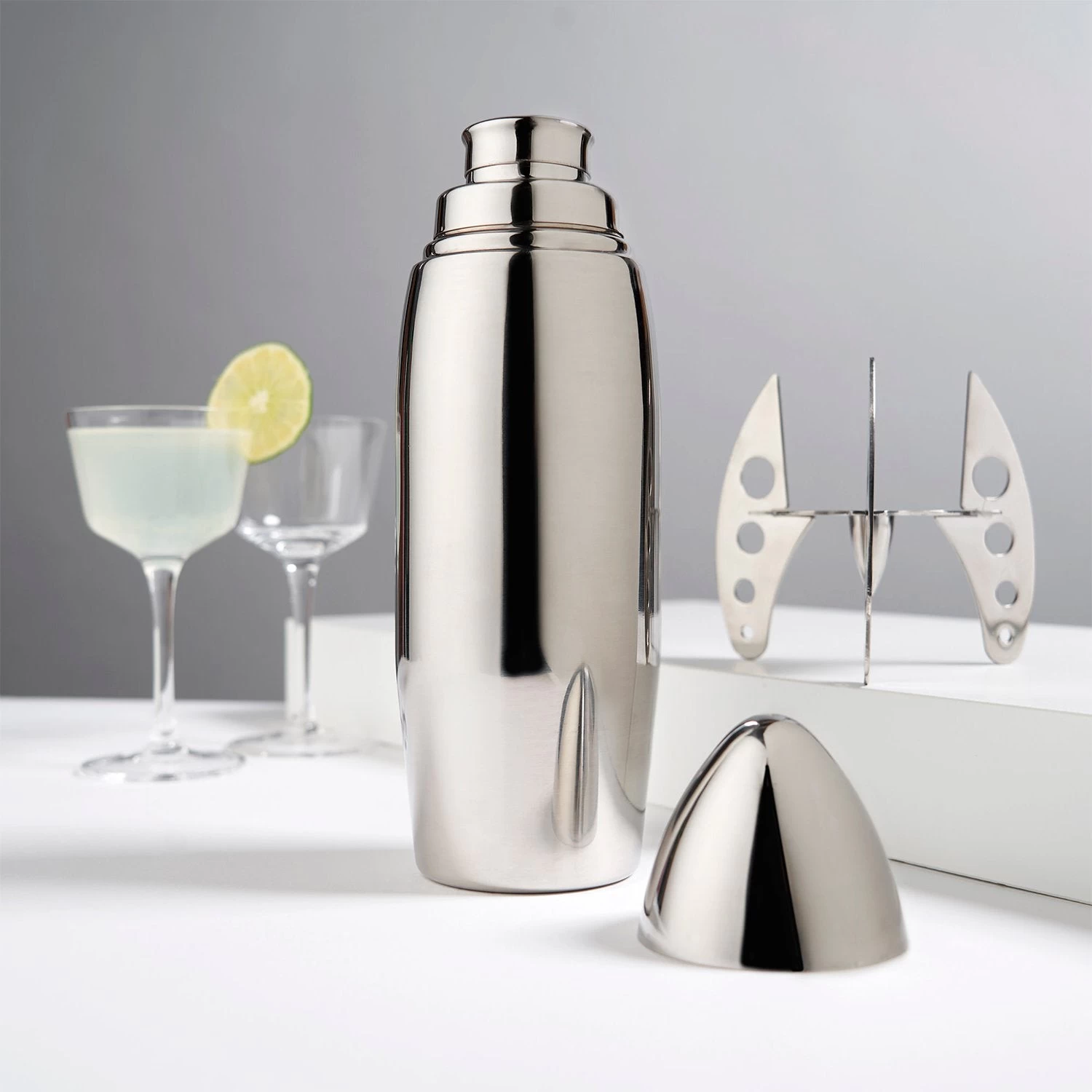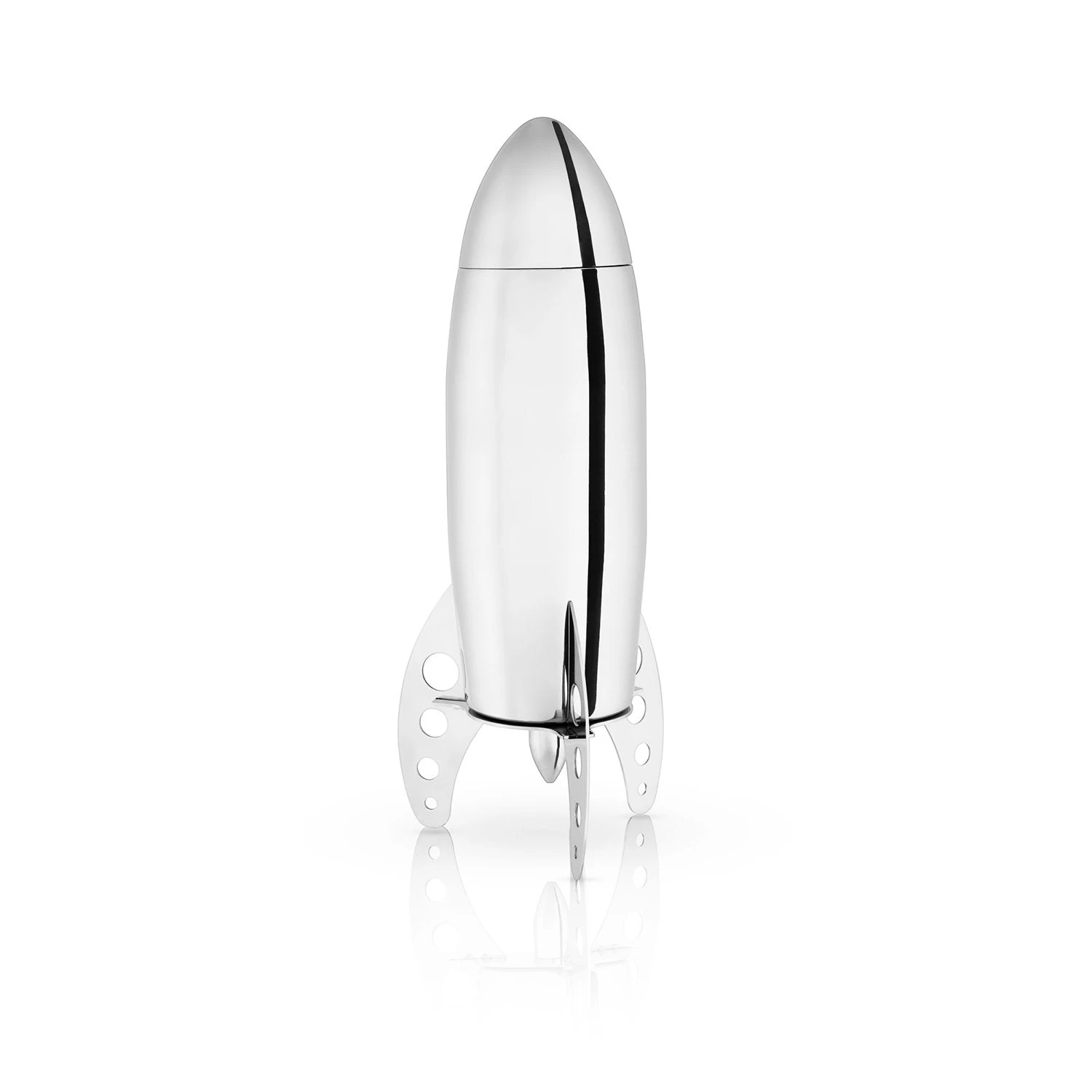 Sleek and space-worthy, our retro stainless steel rocket cocktail shaker holds 24 ounces incorporating a strainer, lid, capsule-esque cap, aerodynamic body and launch-ready shaker stand. Hand wash recommended.