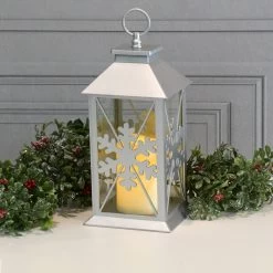 Brighten up your winter decor by incorporating this delightful battery operated snowflake lantern into your decor. This silver molded plastic lantern with a snowflake on all four sides includes a flameless candle with a 6 hour timer feature. The LED candle provides a soft amber glow that illuminates through the crystal clear glass panels.