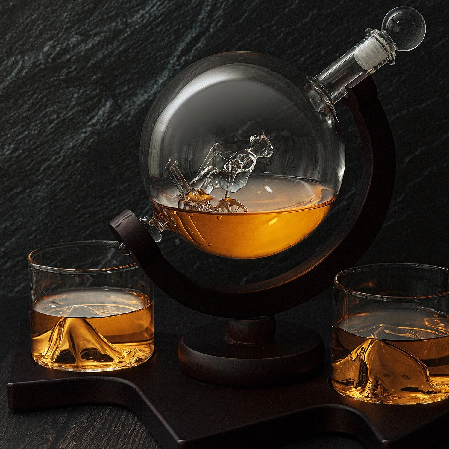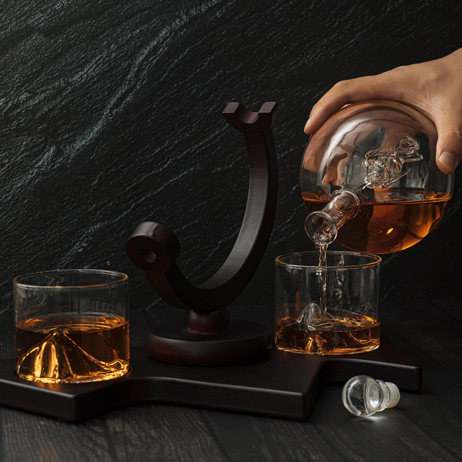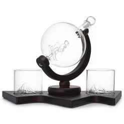 Wine Savant Ski decanter How will you serve your favorite spirits this season? Hit the slopes in style and impress guests at your next ski party with the elegant Ski decanter set. This innovative 850 ml wine vessel features an expressive skier on the slopes creating the illusion of movement, two 12 oz glasses depicting a glacier, and an 14″ elegant mahogany wooden base. Be the life of the party and be the envy of your ski runs with this unique decanter set!