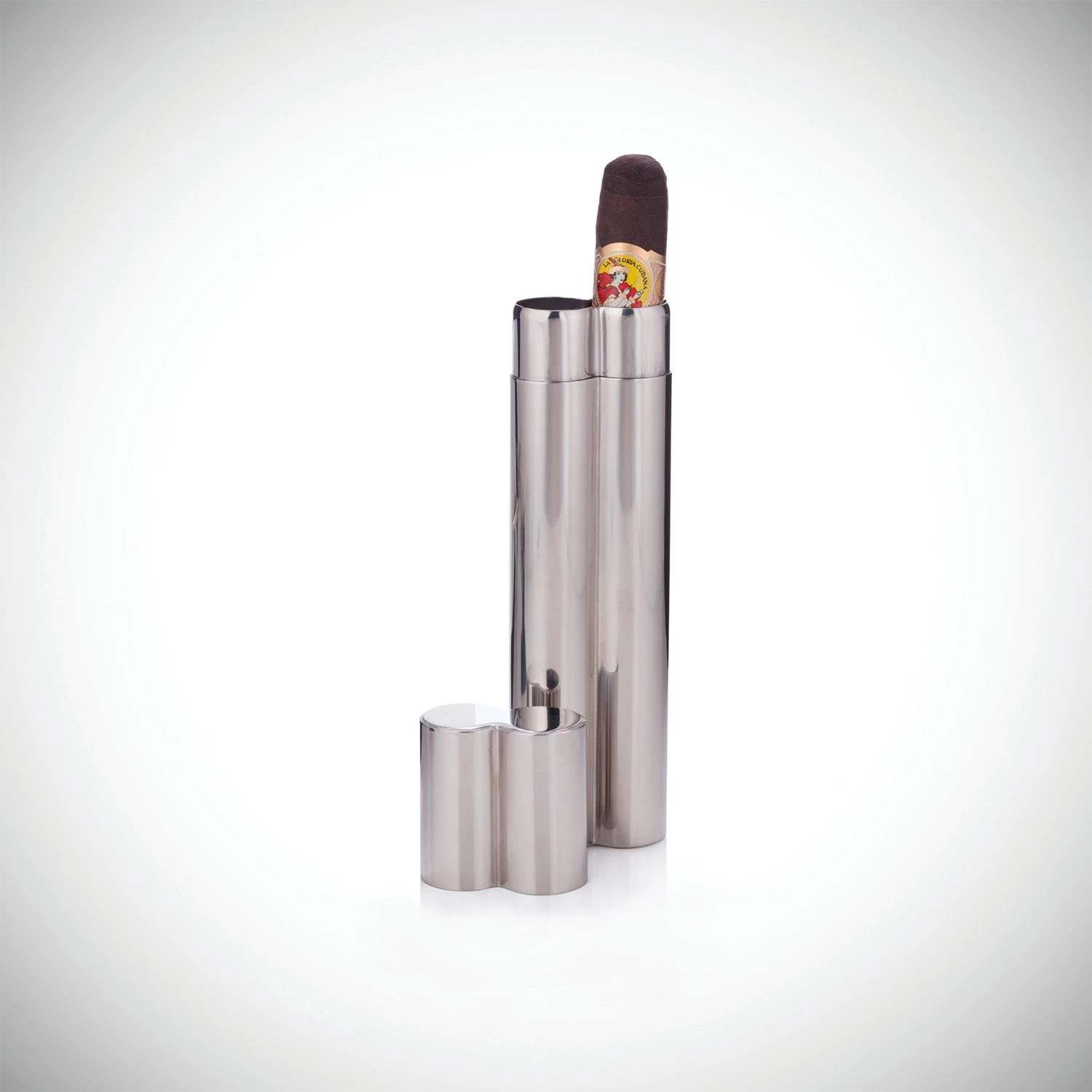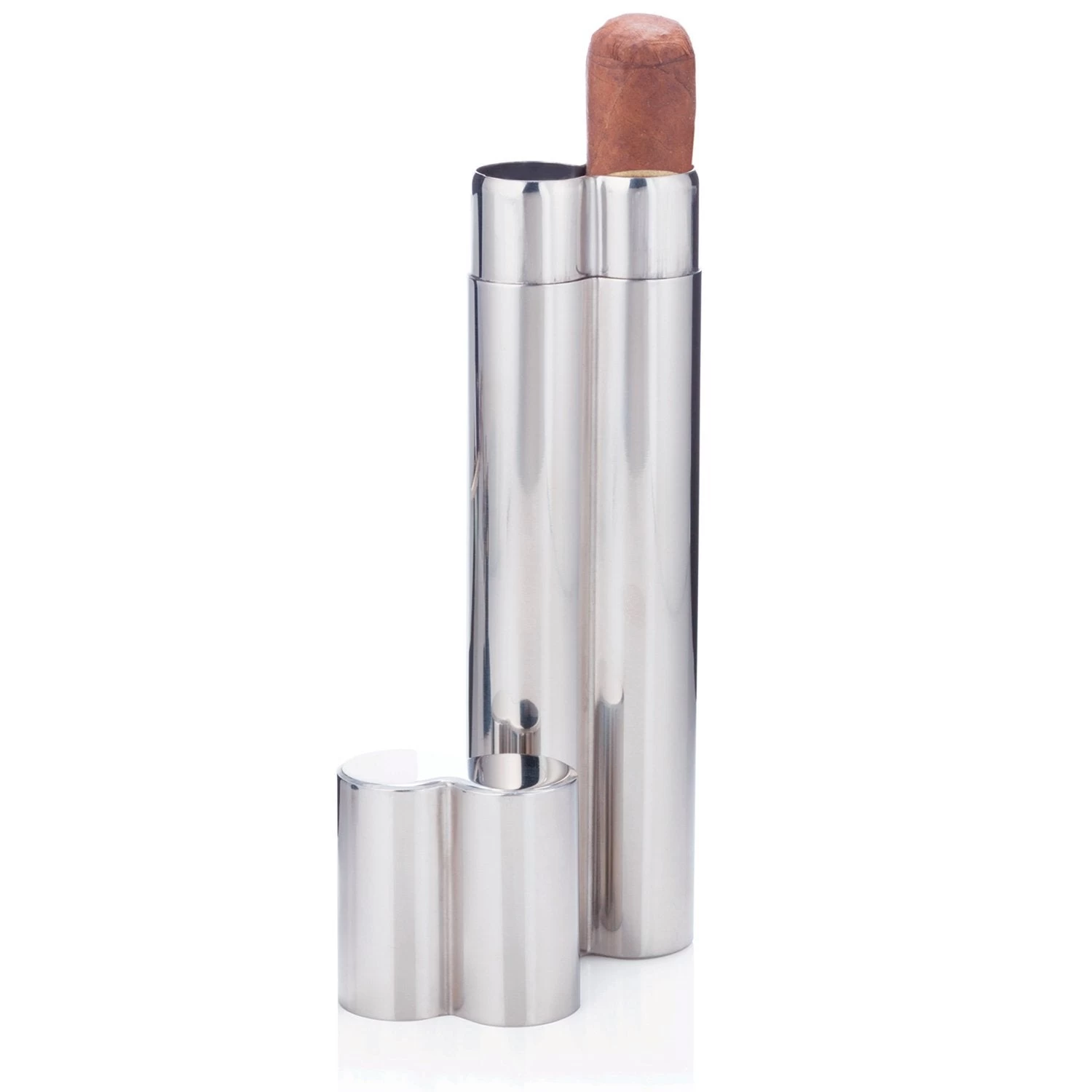 Keep two cigars in a classic 52-gauge stainless steel case to have them close at hand at any opportune moment. Opening the cap releases the rich, leathery aroma of hand-rolled tobacco within.
