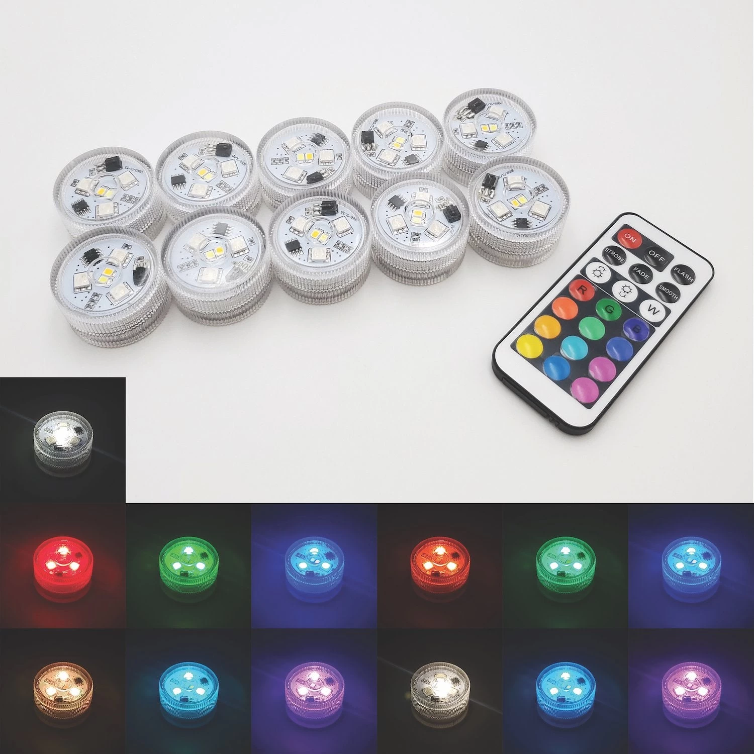 This set of 10 submersible LED lights with a remote control offer 13 color options, a color changing mode with four different color changing options, and a dimmer. Waterproof LED lights add stunning illumination to a vase, bowl, flower arrangement, centerpiece or ice bucket. party or special event. Battery operated water lights add mesmerizing accent lighting in or out of water.