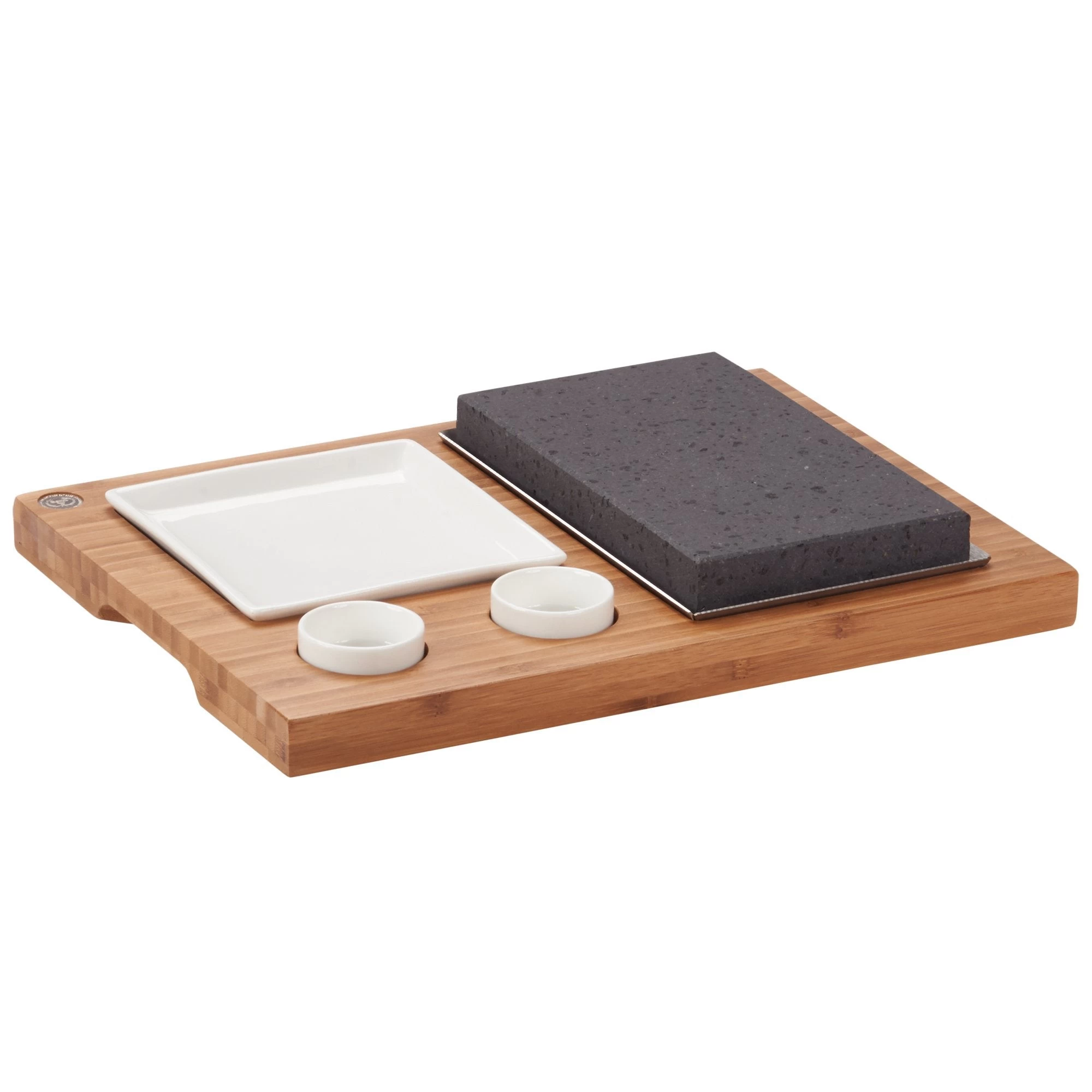 We recommend the Lava Stone is cleaned by hand by submerging in water for 5 mins to let any remaining heat dissipate and then simply wipe the surface of the stone. Scourers can be used as required. The Bamboo Board should just we wiped clean with a cloth and not submerged in water or left damp. The Stainless Steel Tray and Ceramic Plate and Bowls are dishwasher safe.