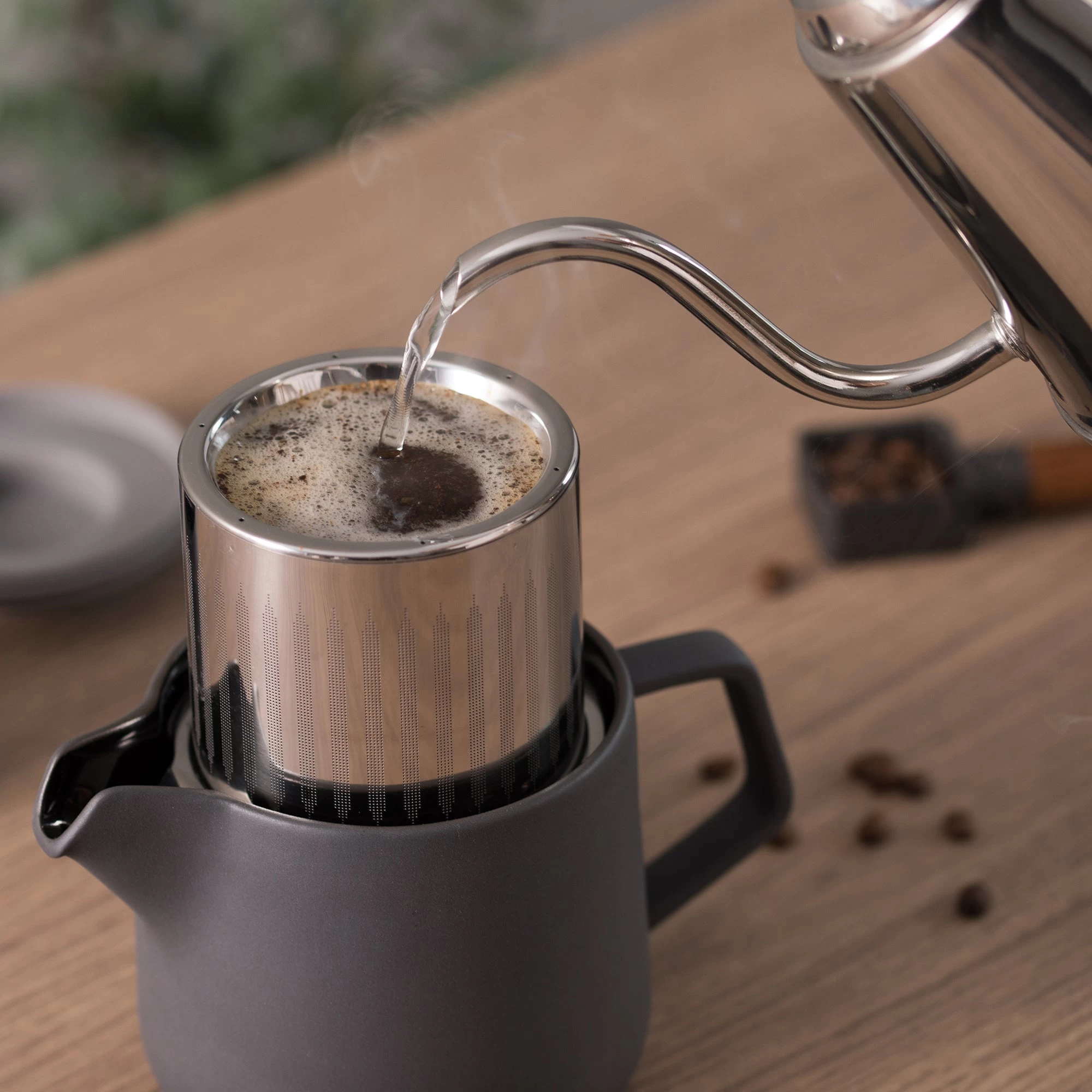 Drop the filter into the pot and you will get the largest tea infuser that provides plenty of room for tea leaves to fully expand. Flip the filter and set it atop the pot and you will get a 250-micron, paperless mesh filter for pour-over coffee. The filter traps just the right amount of essential oils. So whether it’s tea or coffee, we’ve got you covered!