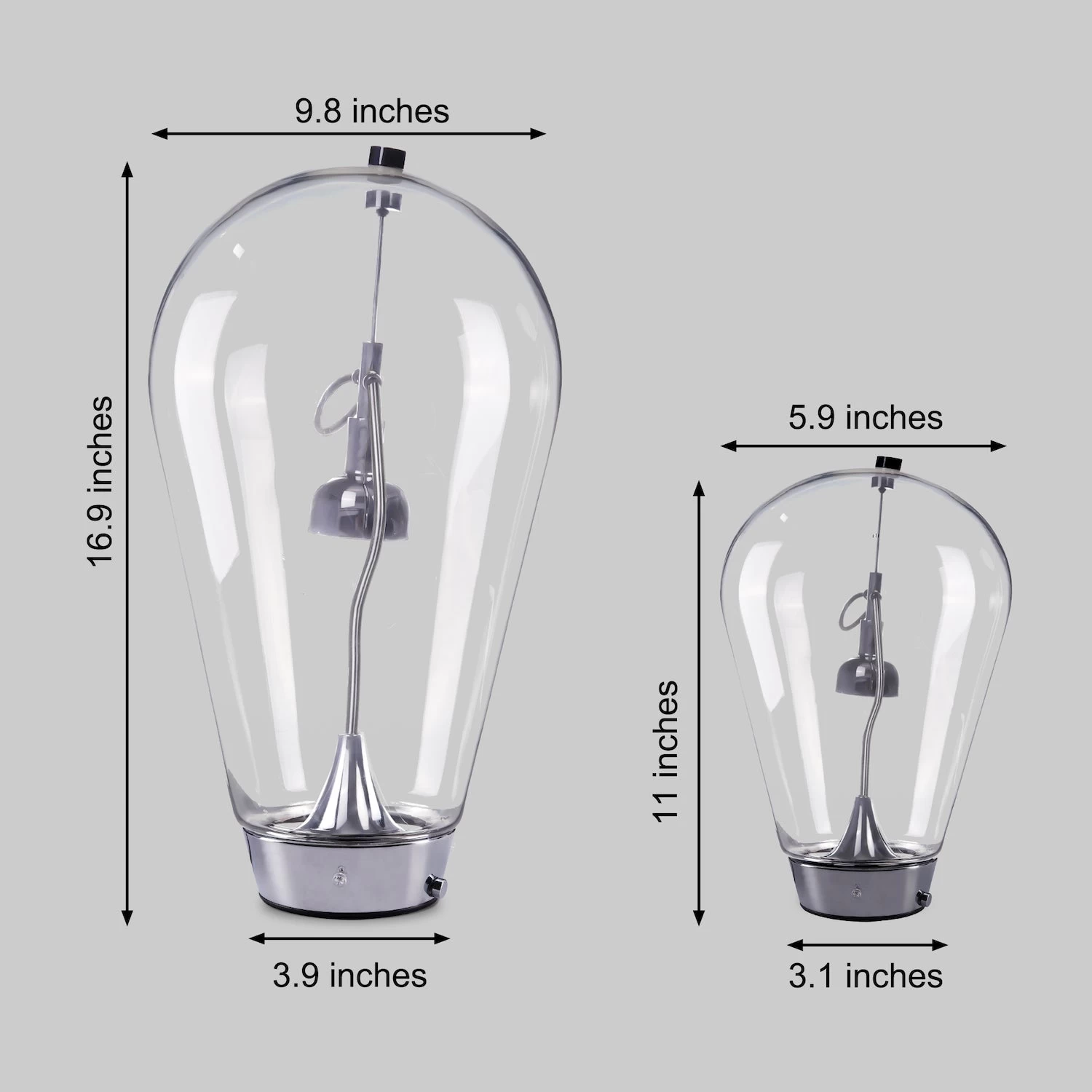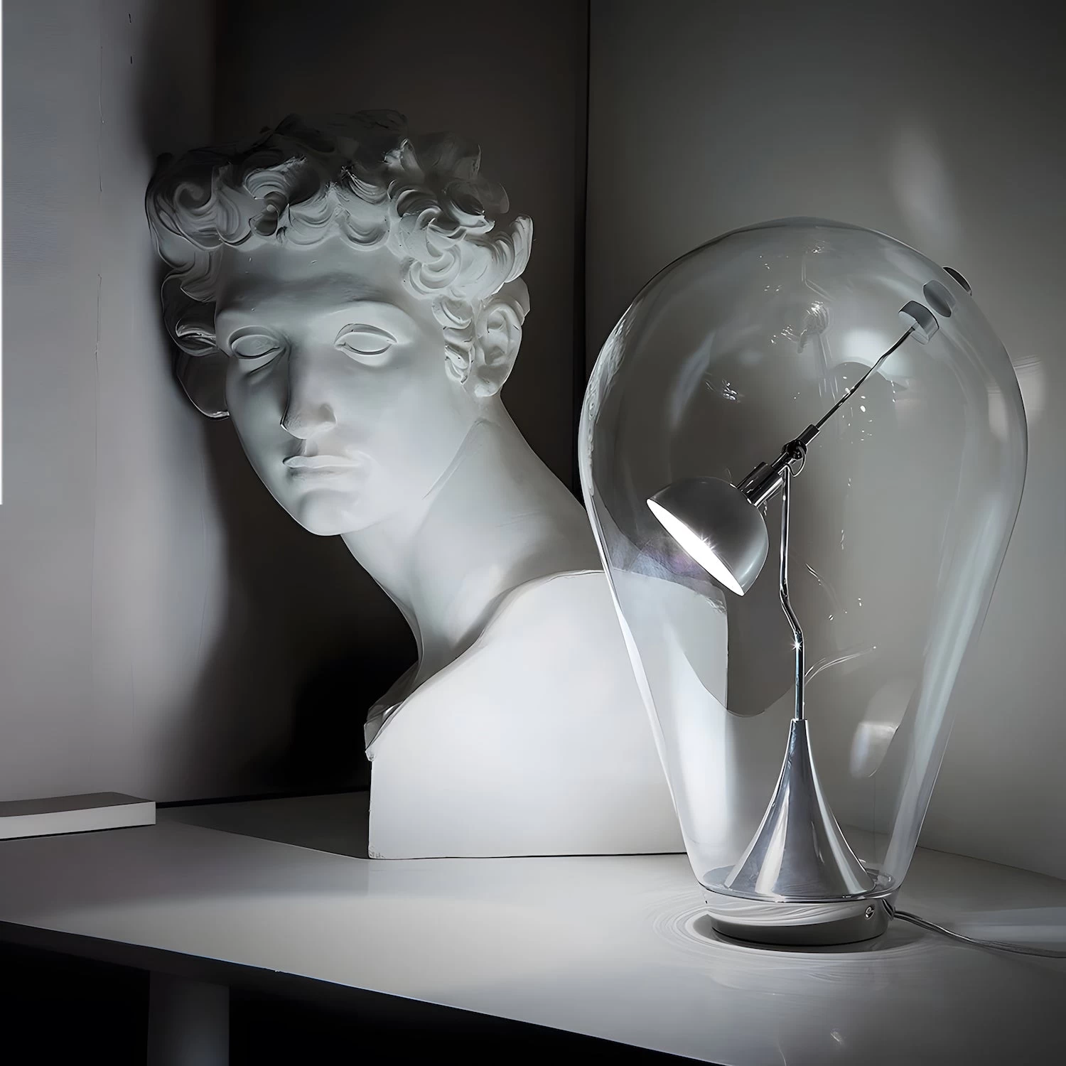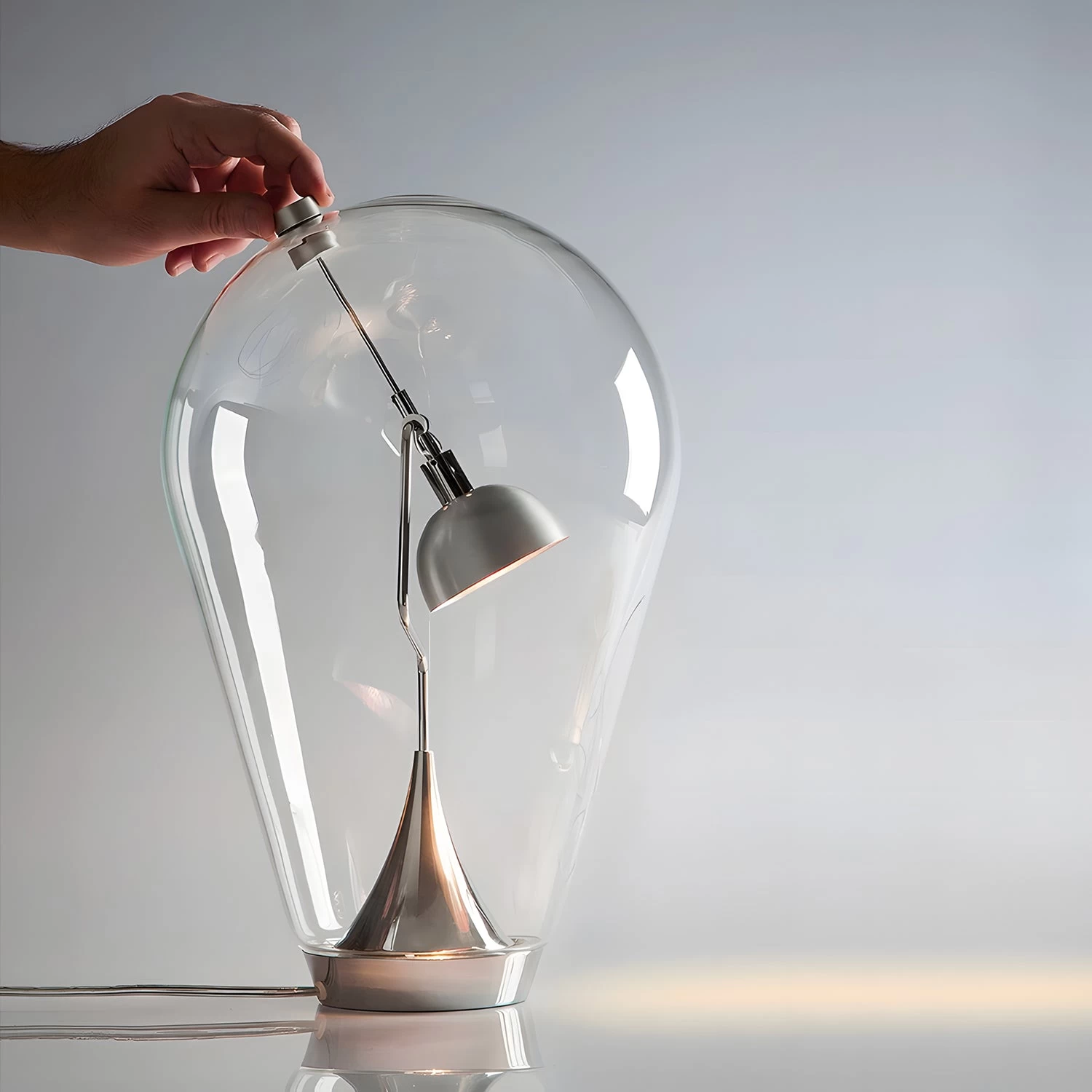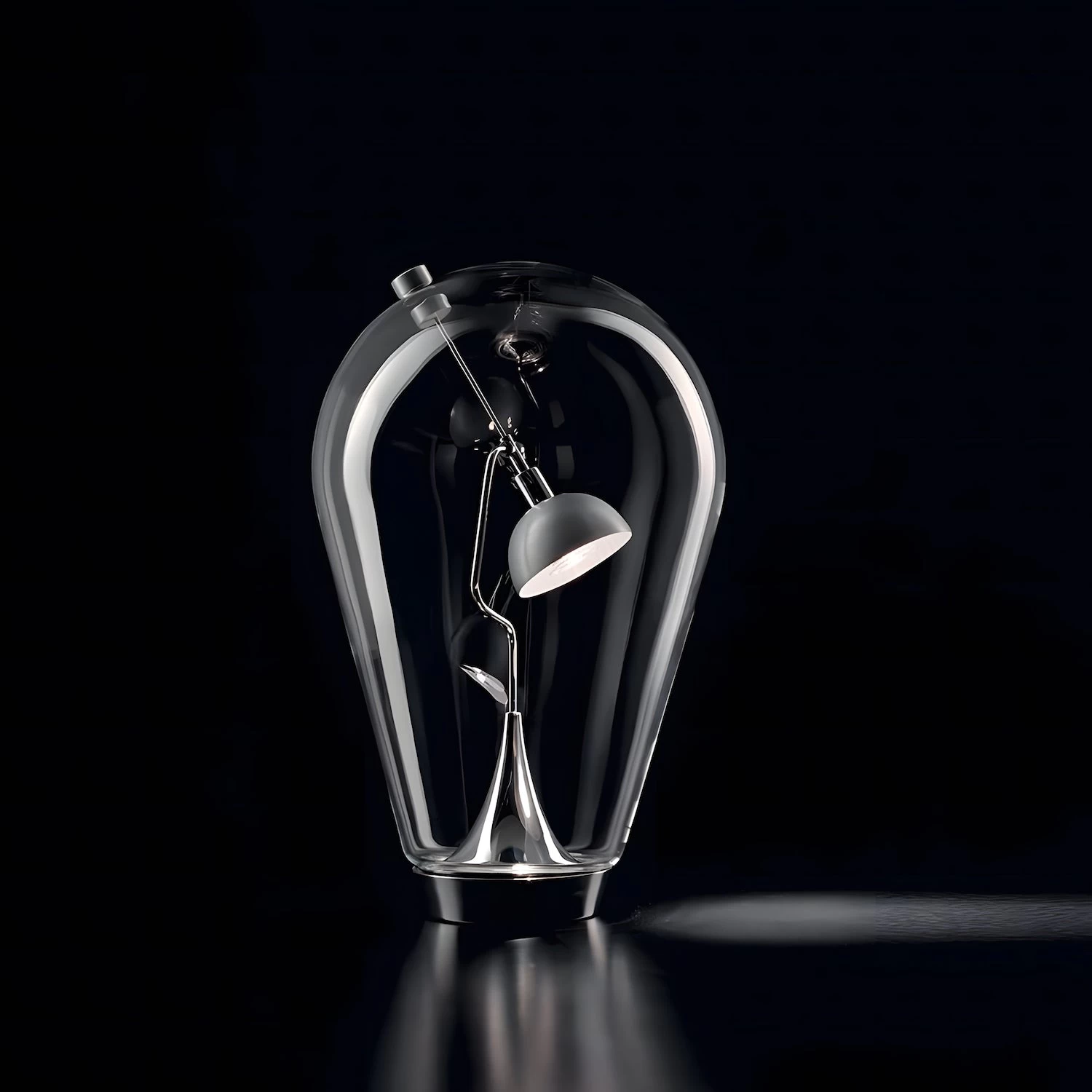 An exquisite spotlight encased in an oversized light bulb to add extraordinary style and flair to your tabletop decor. The Meta Table Lamp embodies the essential idea that form follows function, as espoused by the influential Bauhaus school. The lamp is crafted of clear glass and nickel-plated metal, and has a simple geometric shape – a circular base, slim shaft, and spherical shade. The angle of illumination can be adjusted by moving the magnet on the glass lampshade.