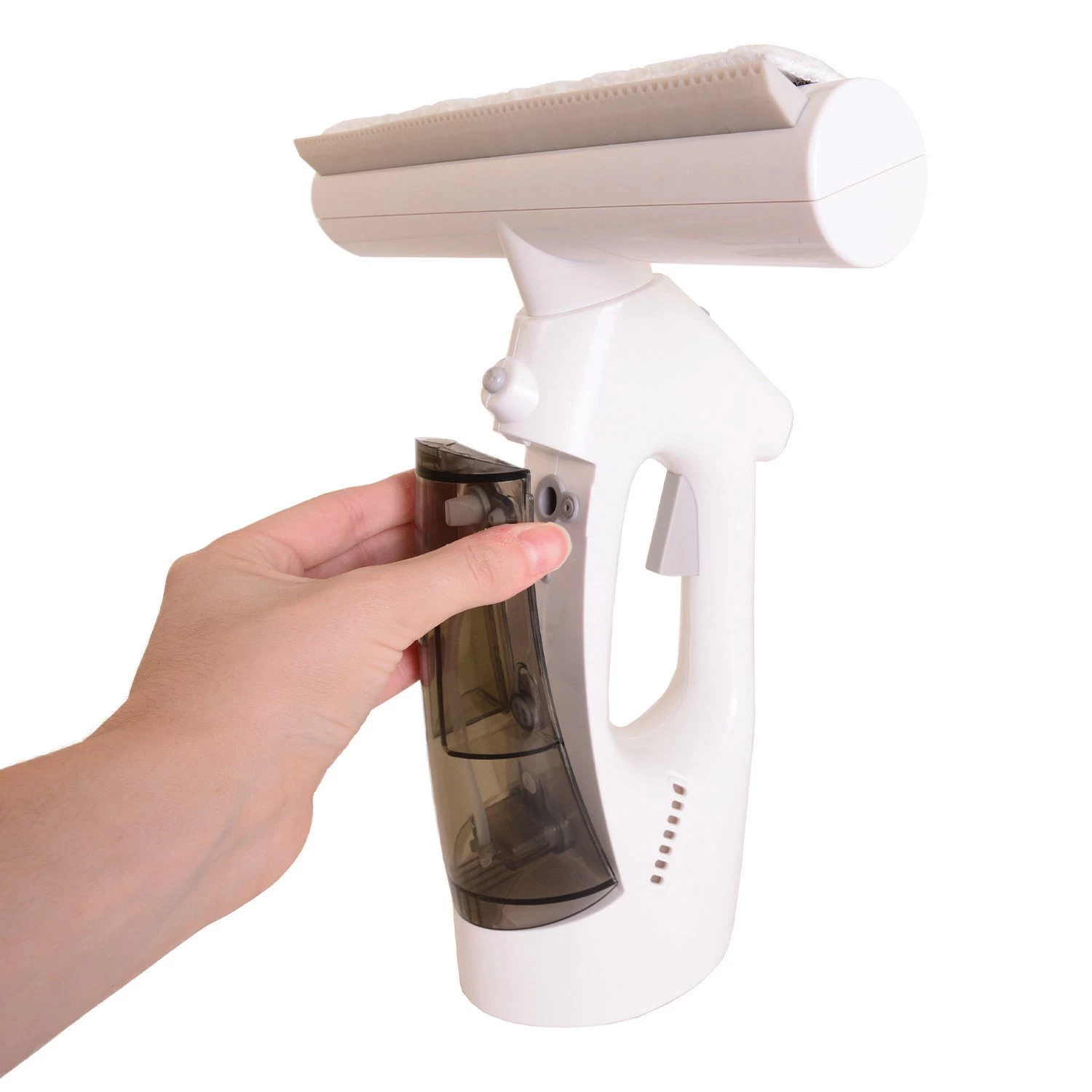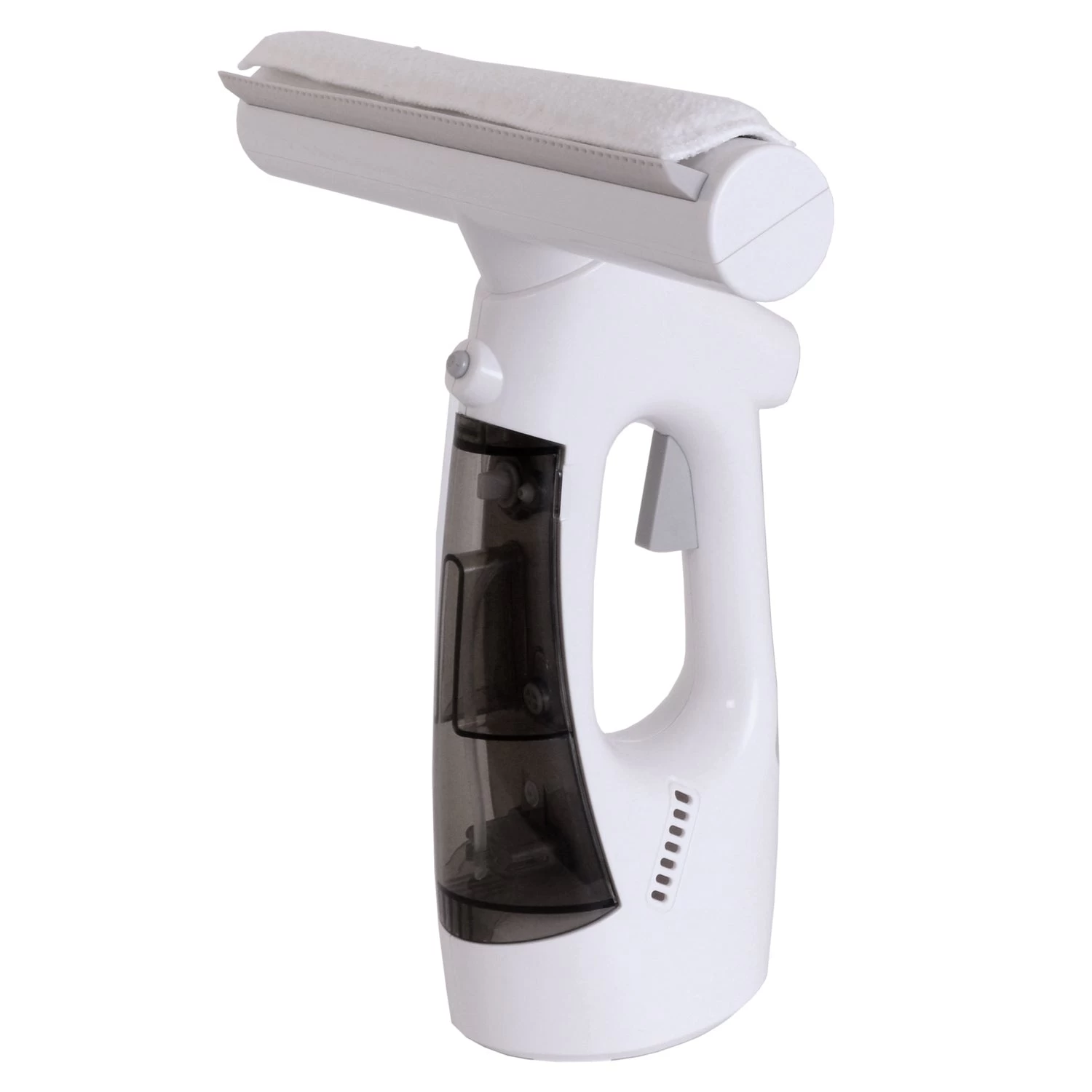 Cordless all-in-one water vacuum. Get crystal-clear windows every time with this all-in-one spray, squeegee, and water vacuum. Just fill the water reservoir, spray, wipe, and vacuum. Its double tank system stores clean and dirty water separately.