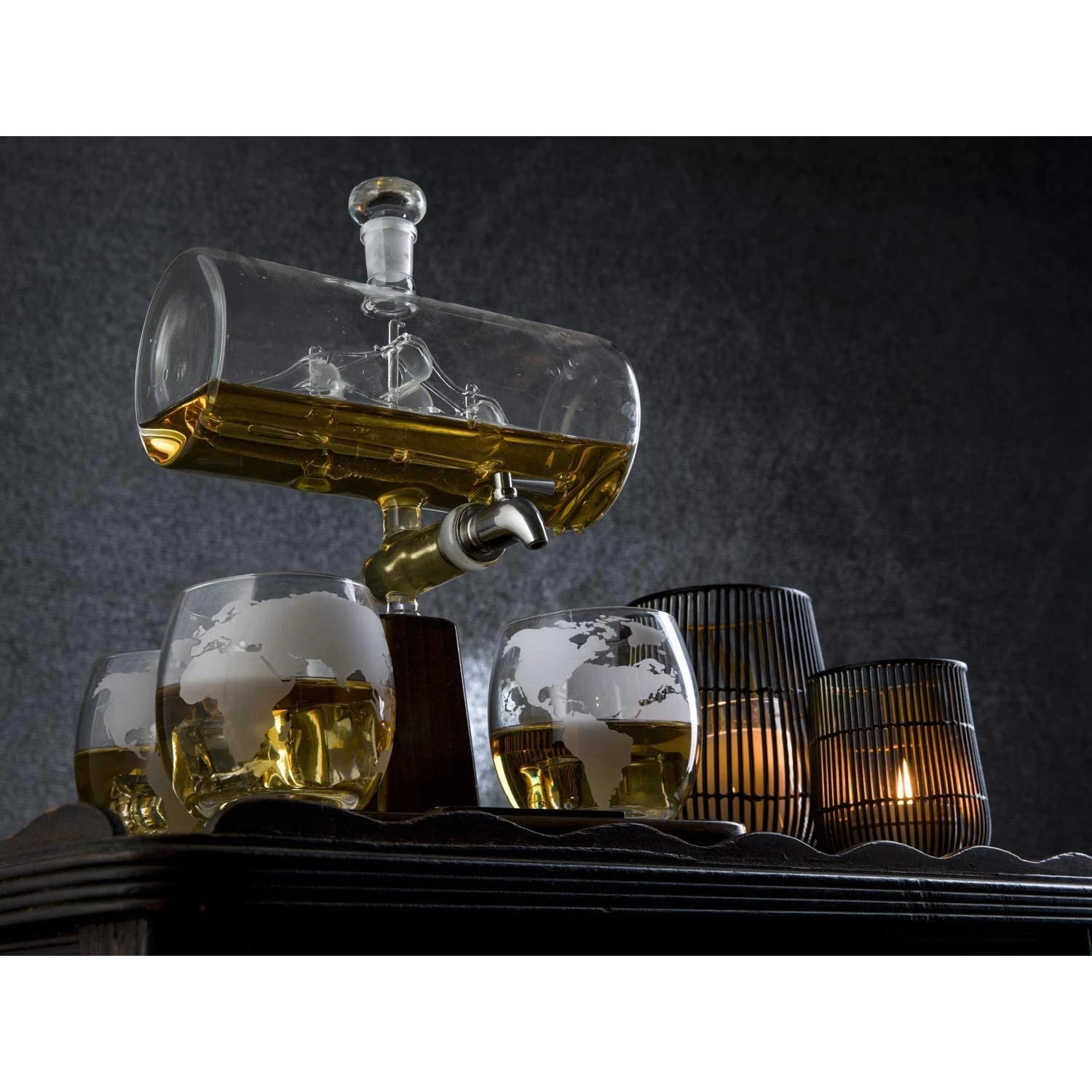 Whiskey Decanter With Antique Ship With 4 Globe Glasses