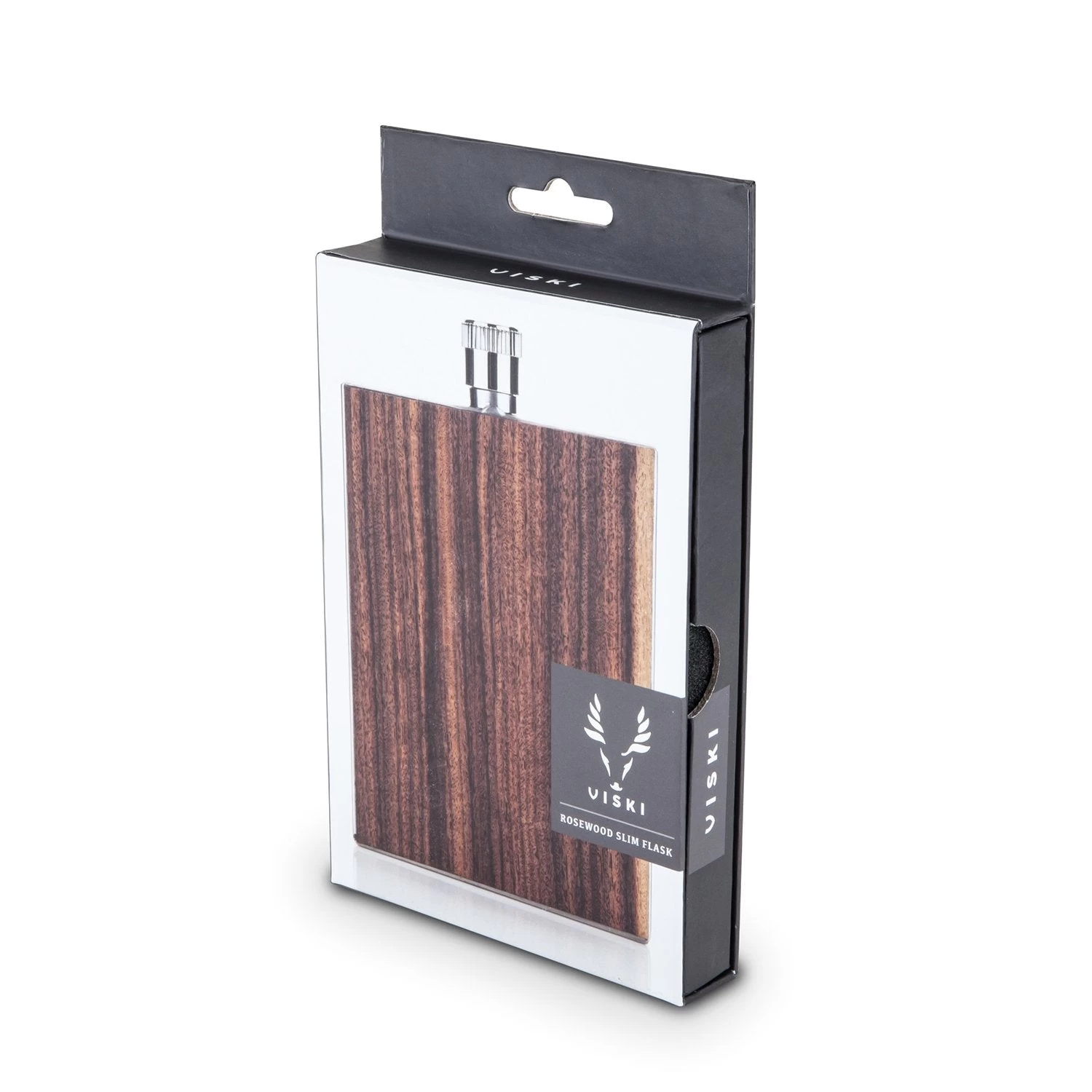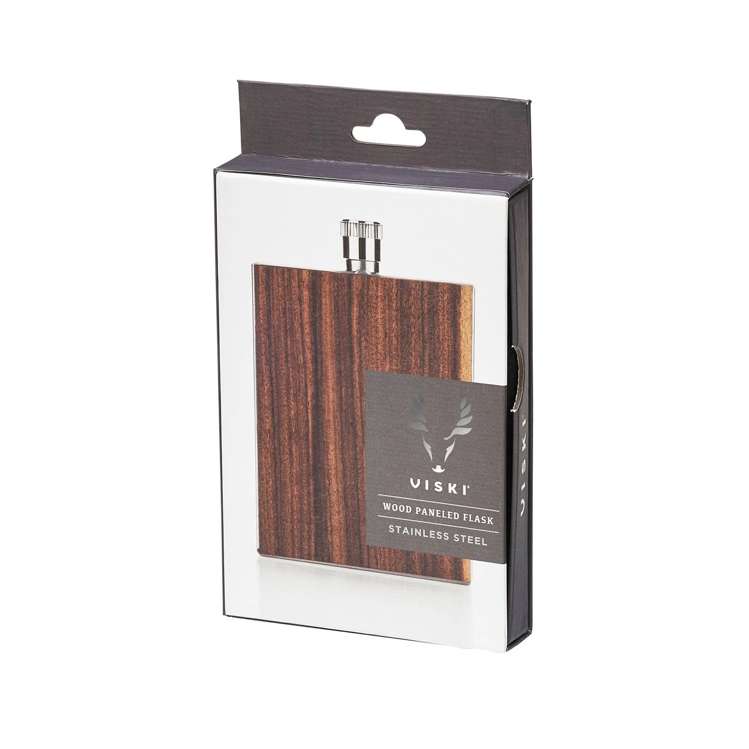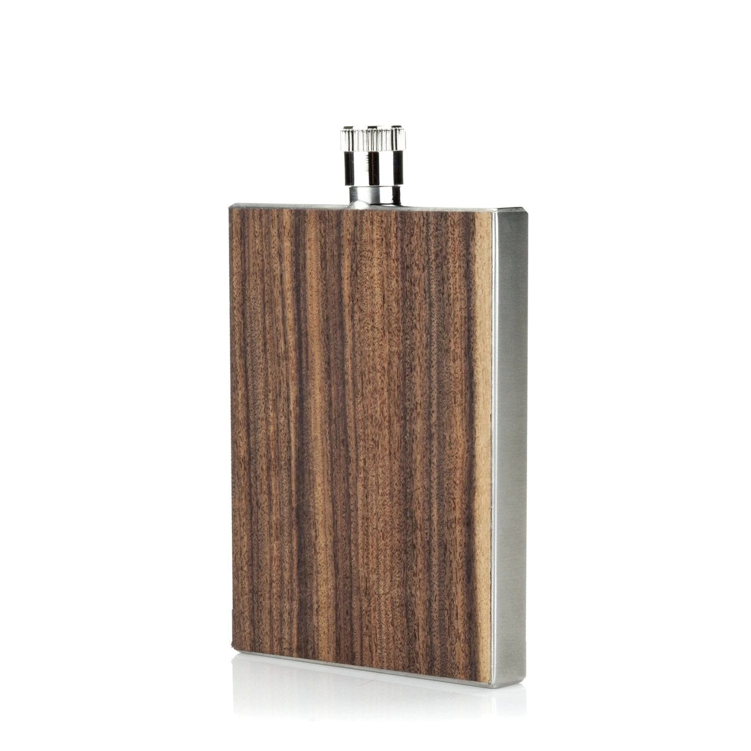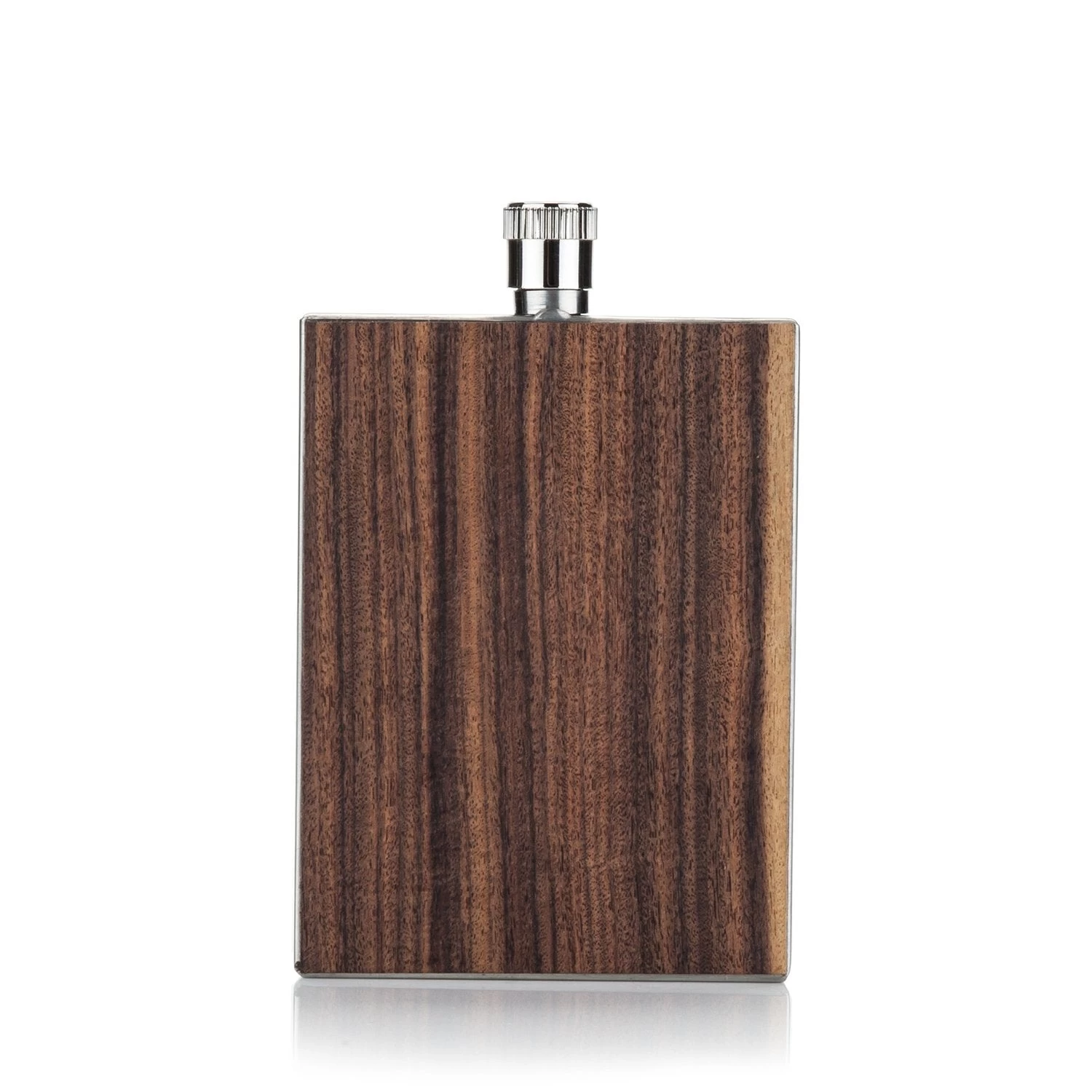 Each side a perfect cut of richly grained wood, this slim rectangular flask accommodates a 2.5-ounce pocketful of firewater. Pick your poison, cap it, and keep it close.